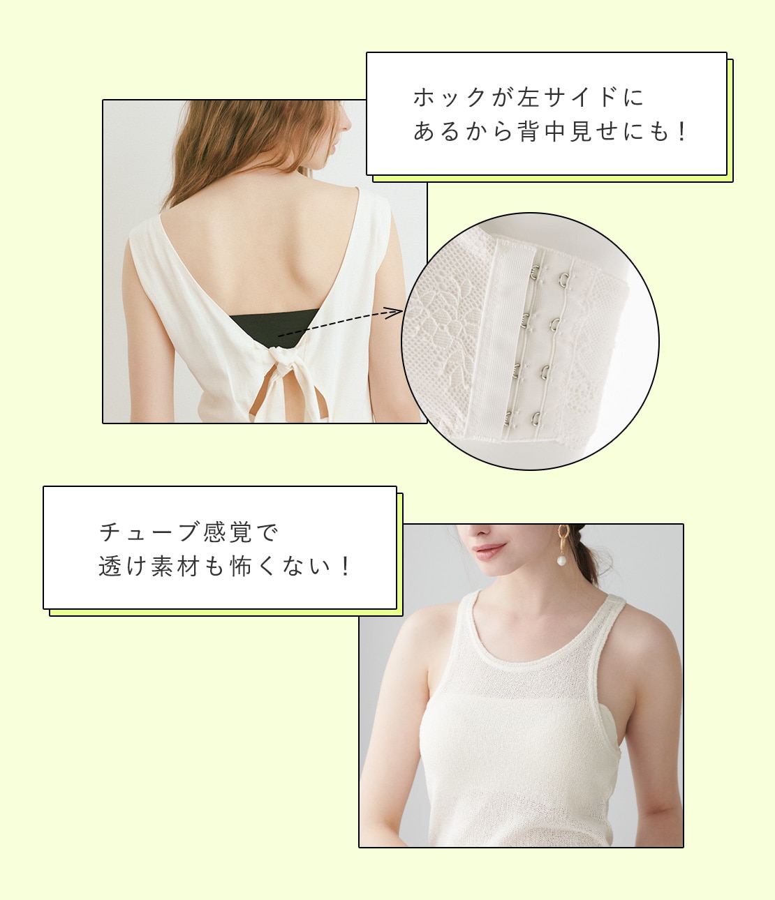 ・背中側にホックがないから、透ける服や背中見せの服にも便利。