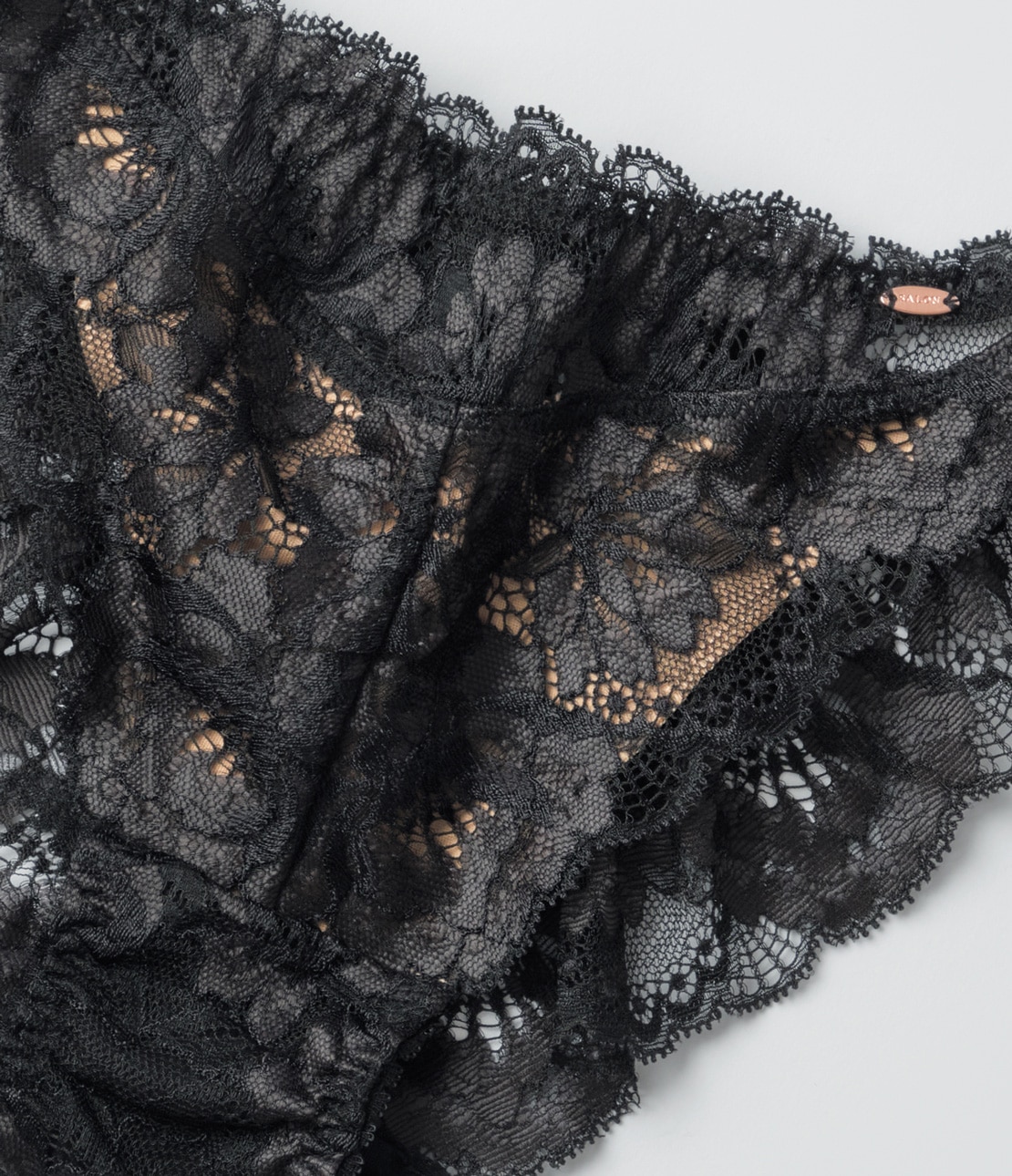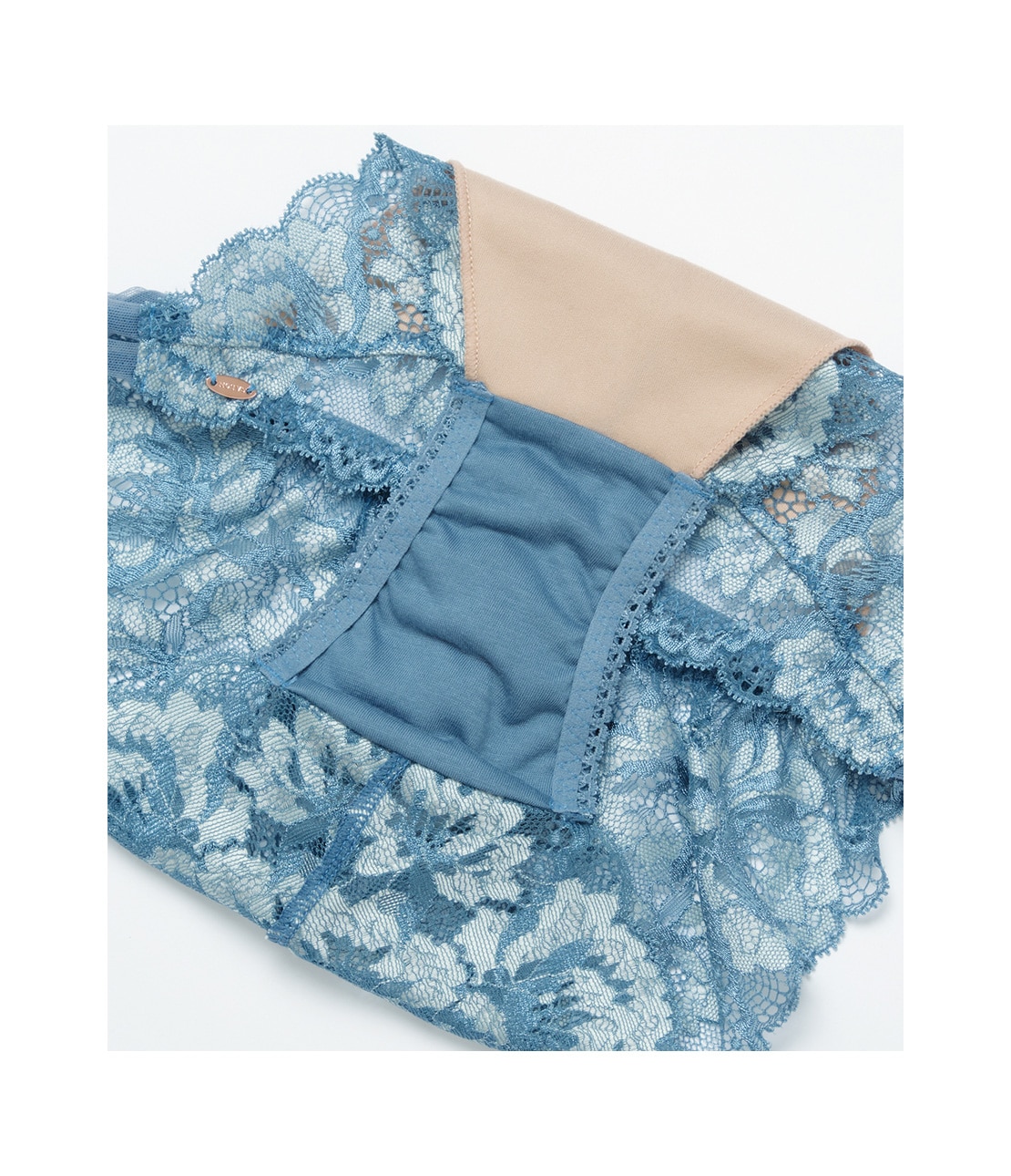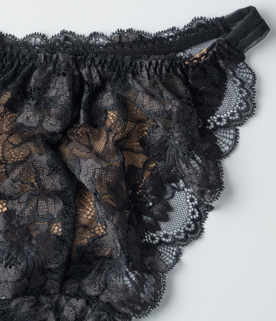 ・ツートーンの花柄ストレッチレースに、ヌードカラーのピーチスキン生地を裏打ちして透けにくい。