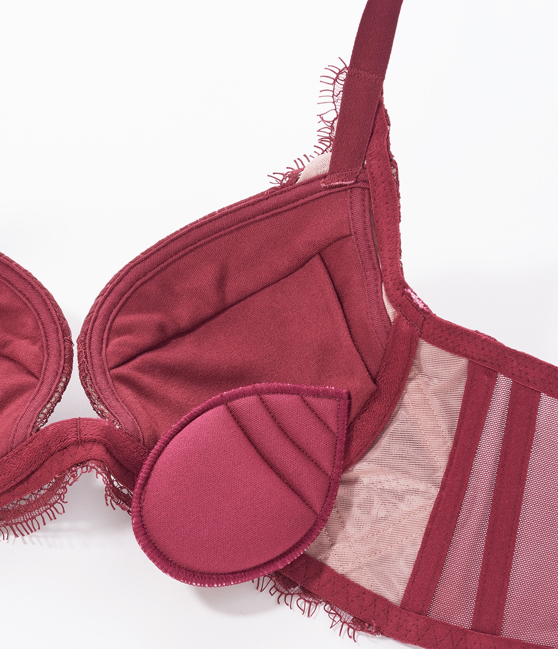 ・大胆なカットのカップでボリュームをぐっと中央に集めて、盛り感のある深い谷間をメイク。