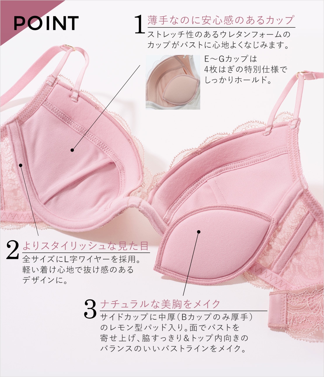 コード糸が繊細さを引き出すストレッチレースをサイドベルトまで贅沢に使用。ストレッチ性のあるカップがバストに心地よくなじんで、L字型ワイヤーとレモン型パッドですっきり寄せ上げます。サイズによってカップ設計やパッドの厚みを変えて、誰もが形良い美胸に。薄手で軽いのに安心感がある、デイリーにぴったりの着け心地です。グラマーサイズも華奢見えするデザインがうれしい。