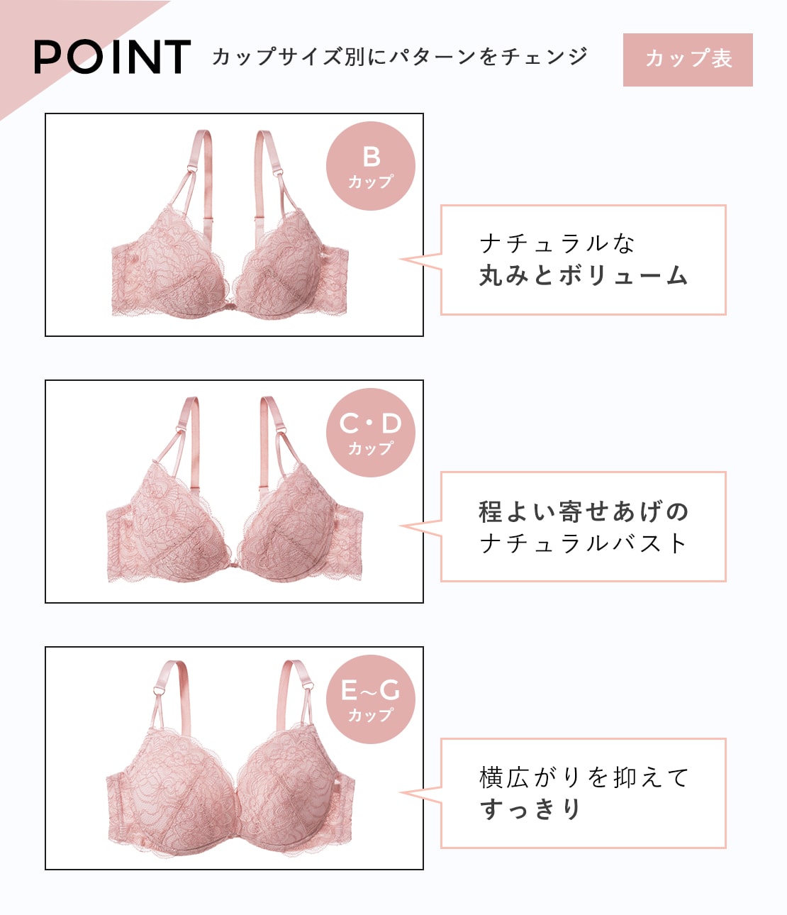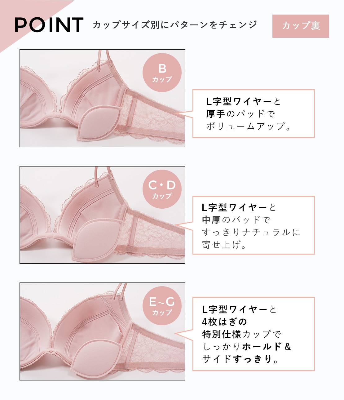 B~Gまでサイズ別設計で、誰もが着けやすい。薄軽カップでラクに美胸メイク。