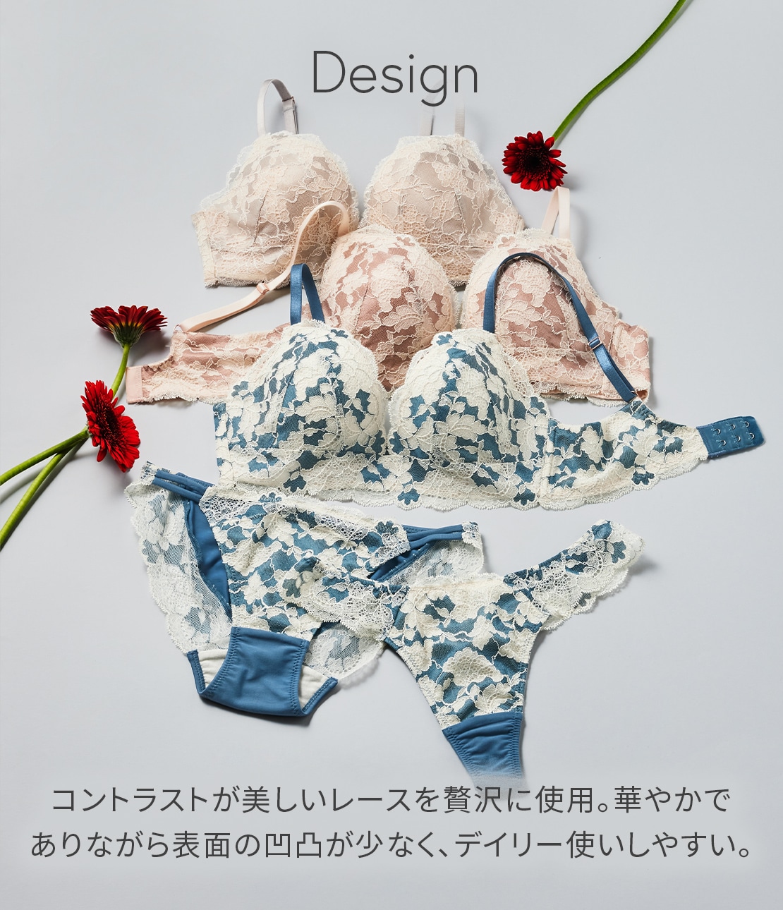 ・ゴージャスなレース使いながらカップ表面に凹凸が少なく、トップスにラインがひびきにくい。
