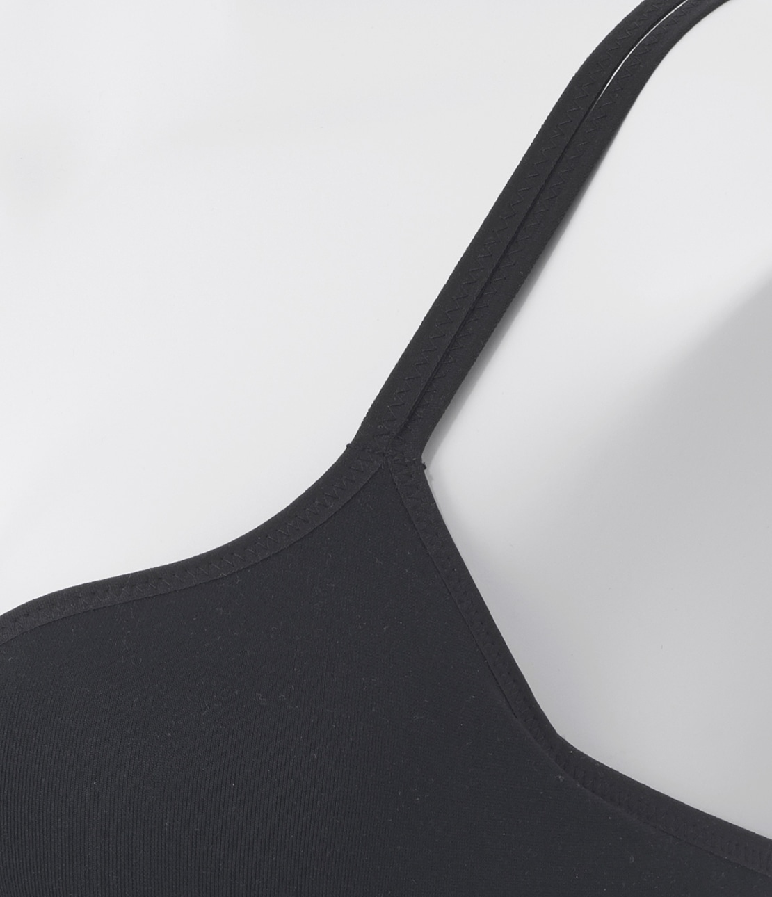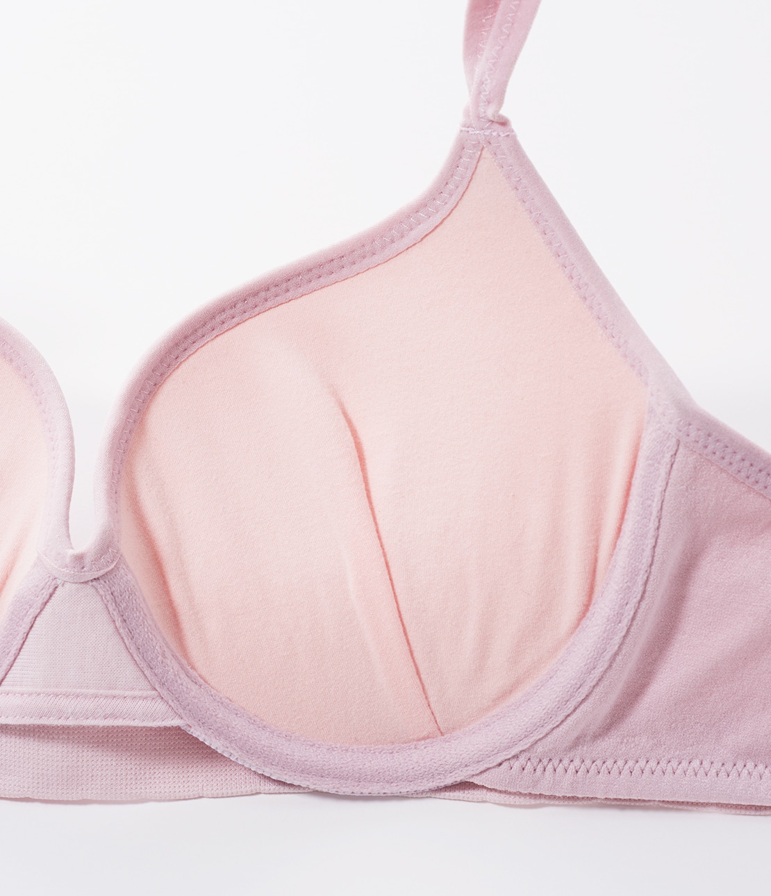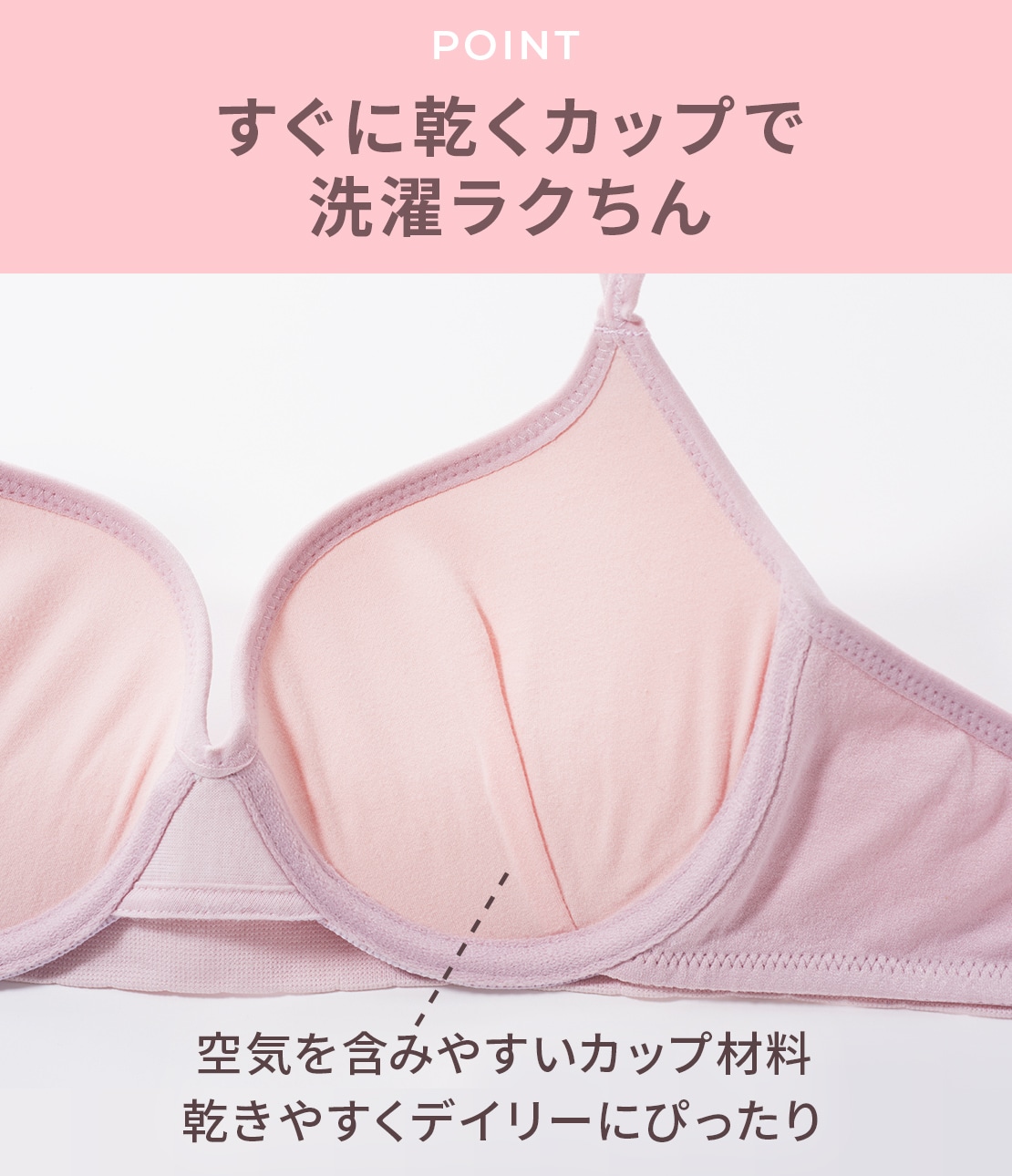 サイズにより厚みが異なる下厚カップに、洗濯後も速く乾く材質を採用。肌側はピンクのコットン混。