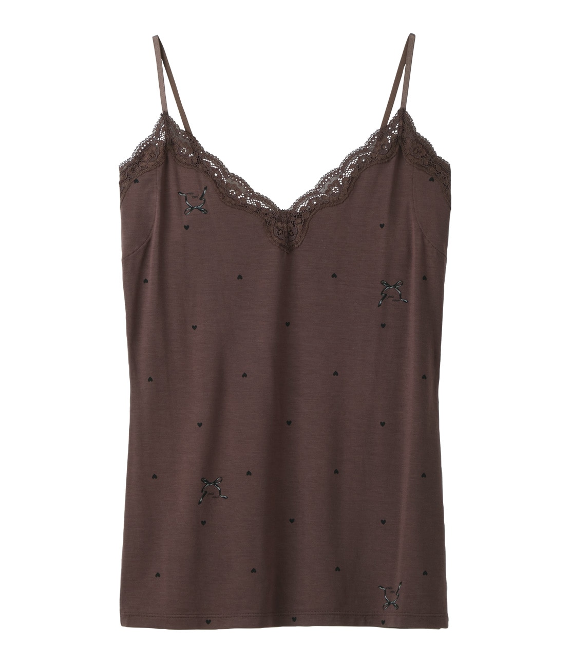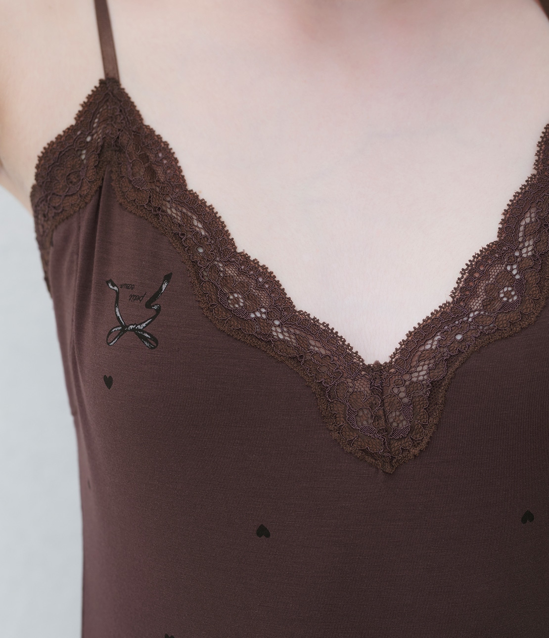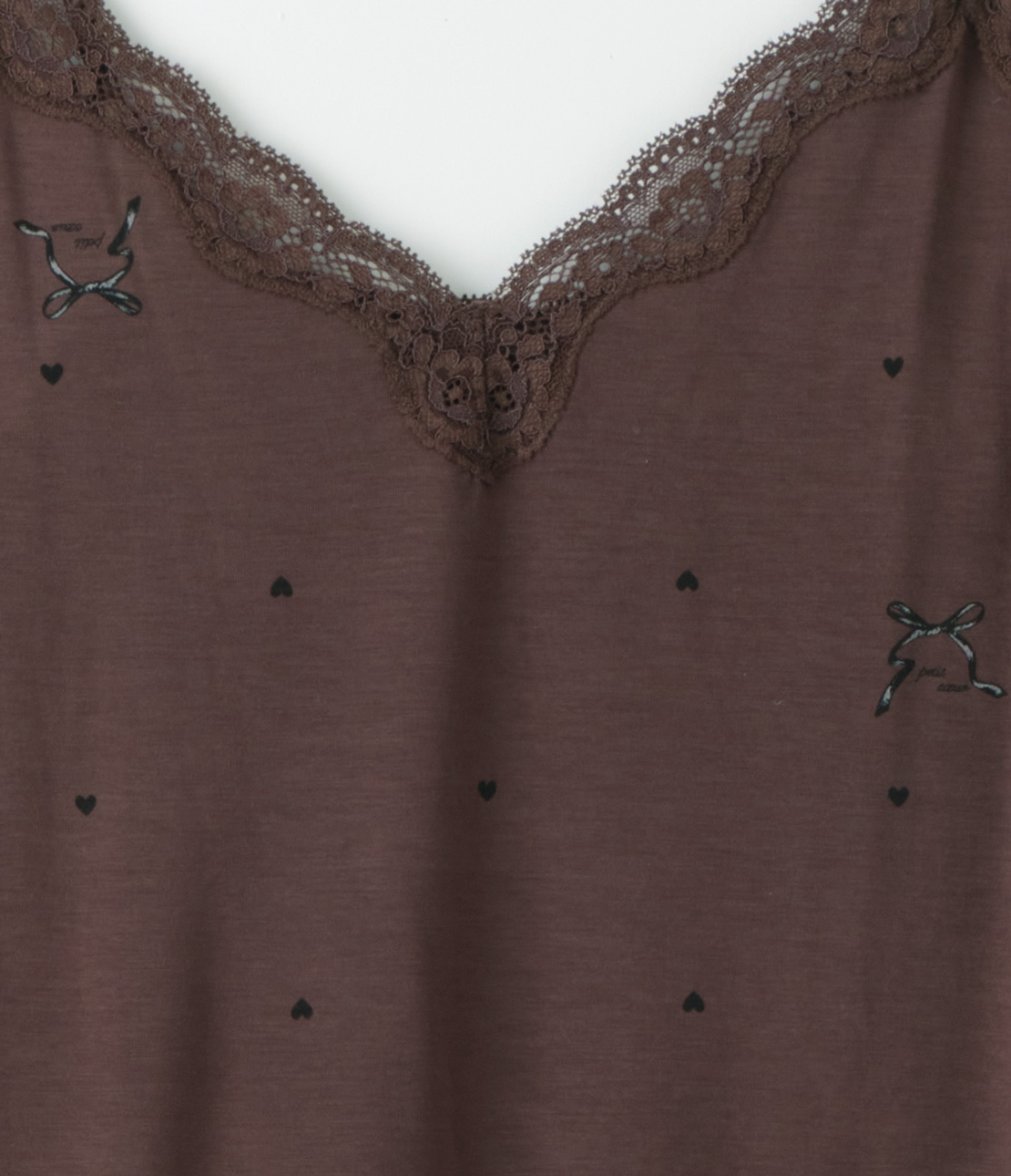 ココアブラウンをベースに、モノトーンのプチハートとリボン柄をプリント。一見ドット柄で、さりげない可愛らしさ。レースもブラウン。
