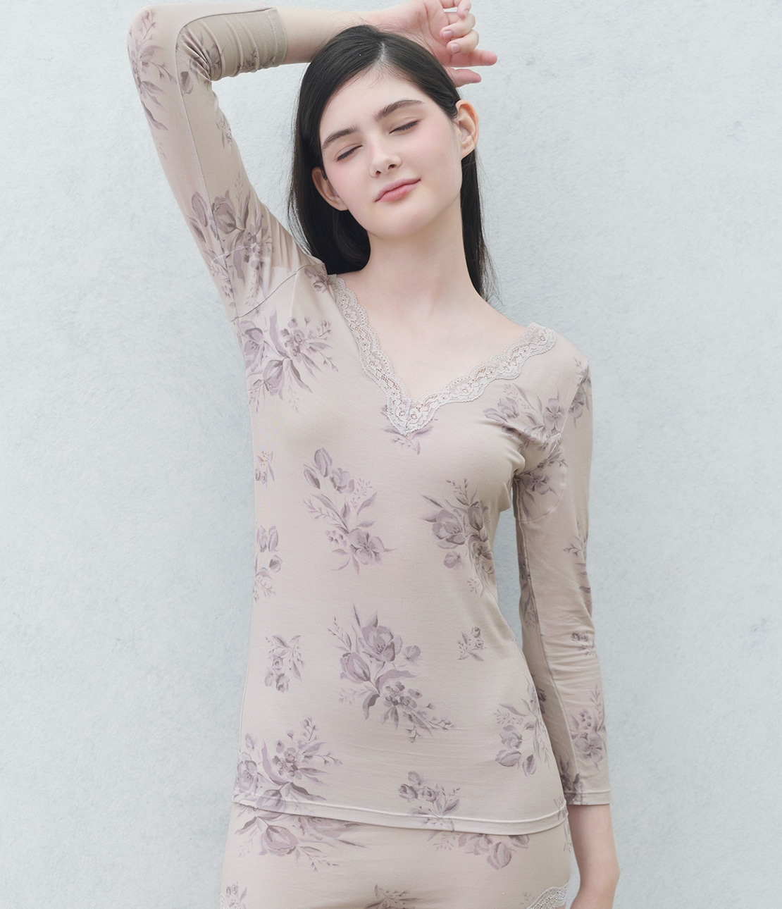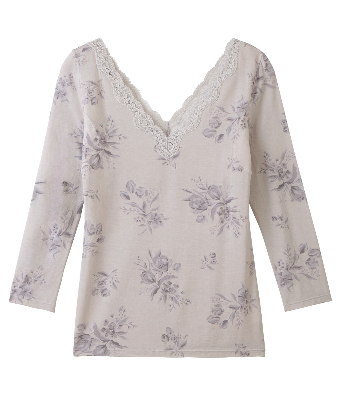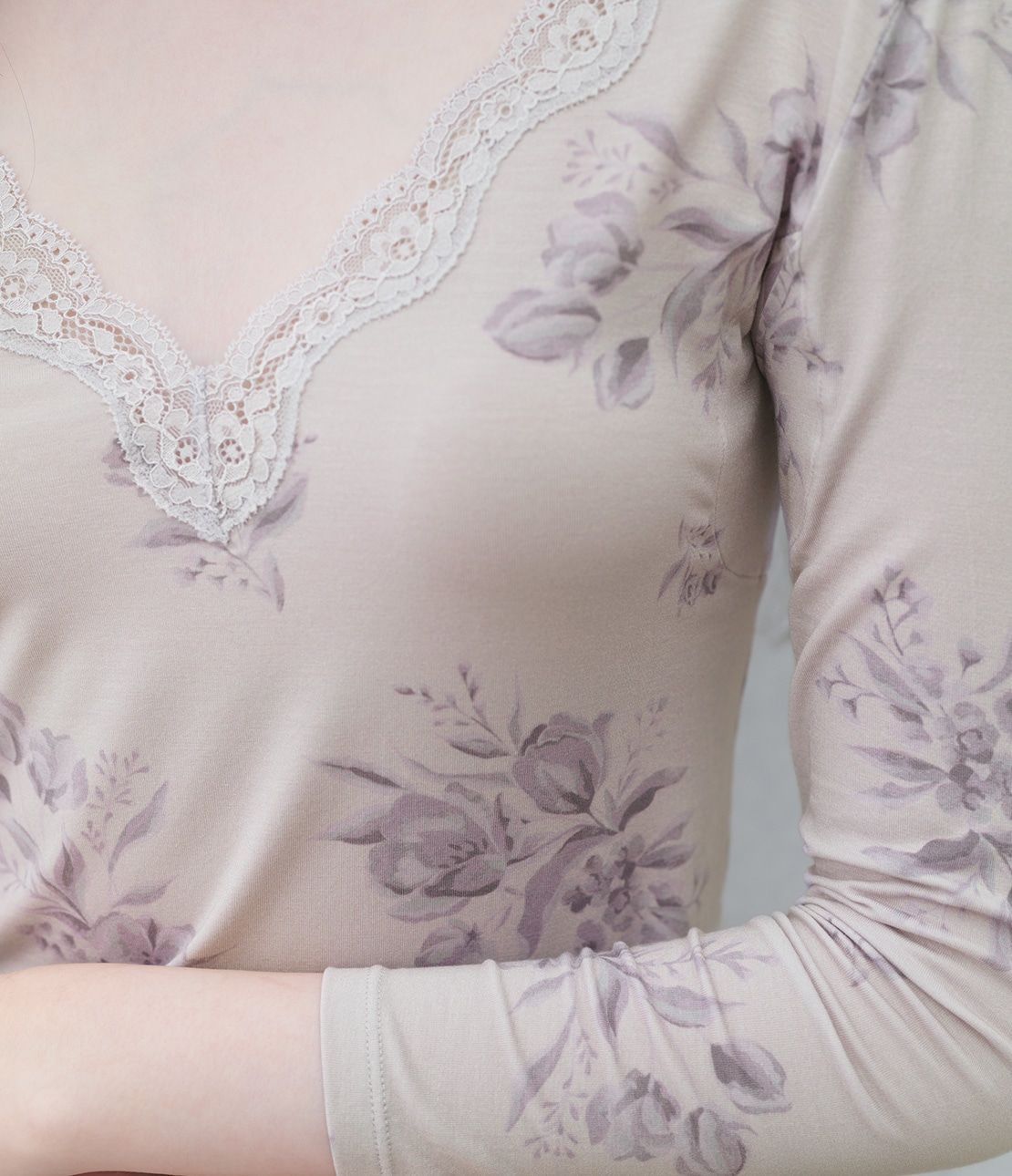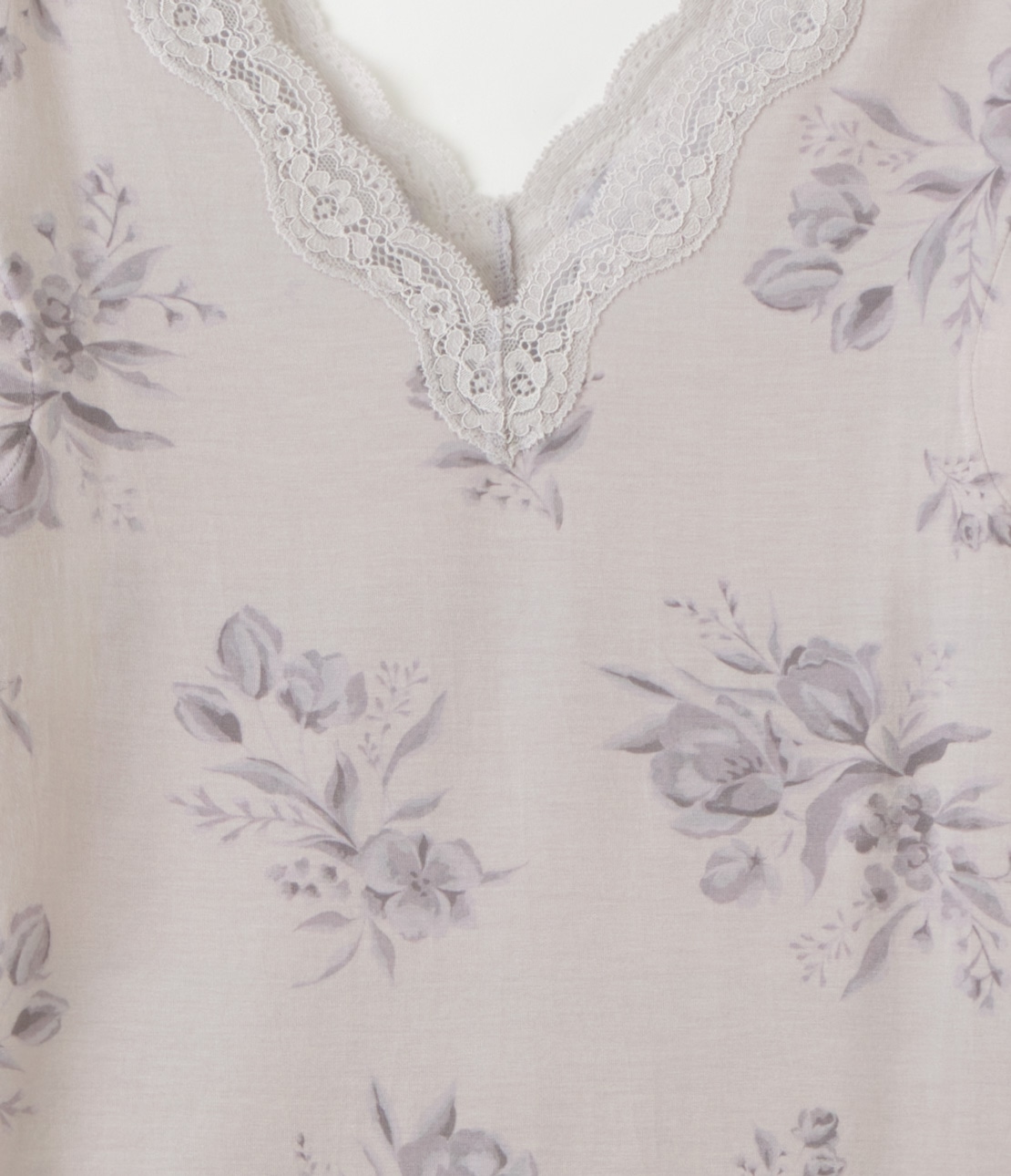 くすんだラベンダーカラーをベースに、ブルーグレーの濃淡で大人っぽいブーケ柄をプリント。レースはライトグレー。