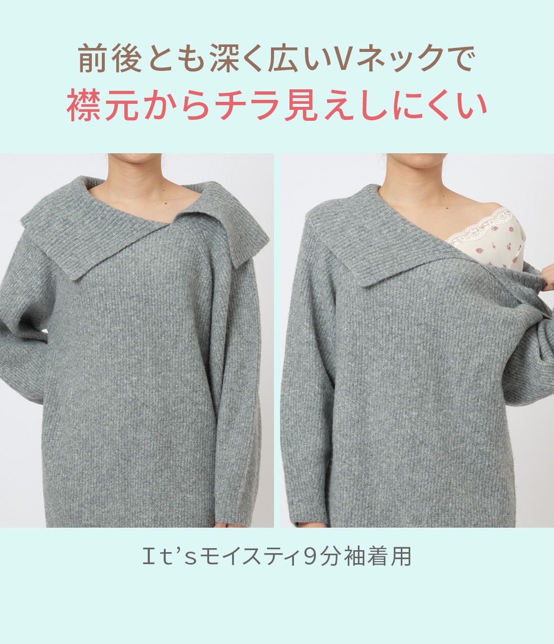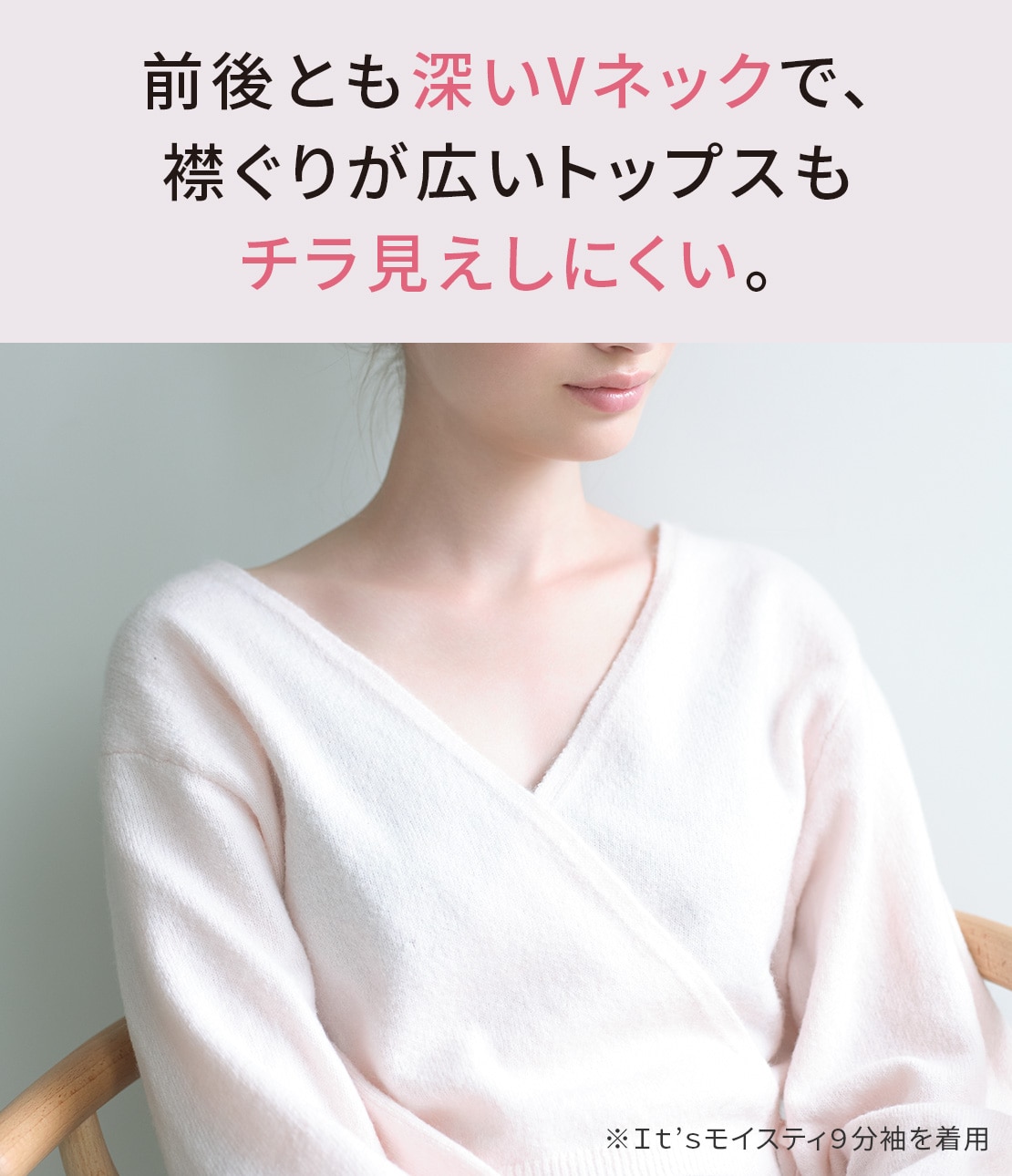 ・スタンダードな9分袖。前後とも深いVネックで、トップスの襟あきからのぞきにくい。