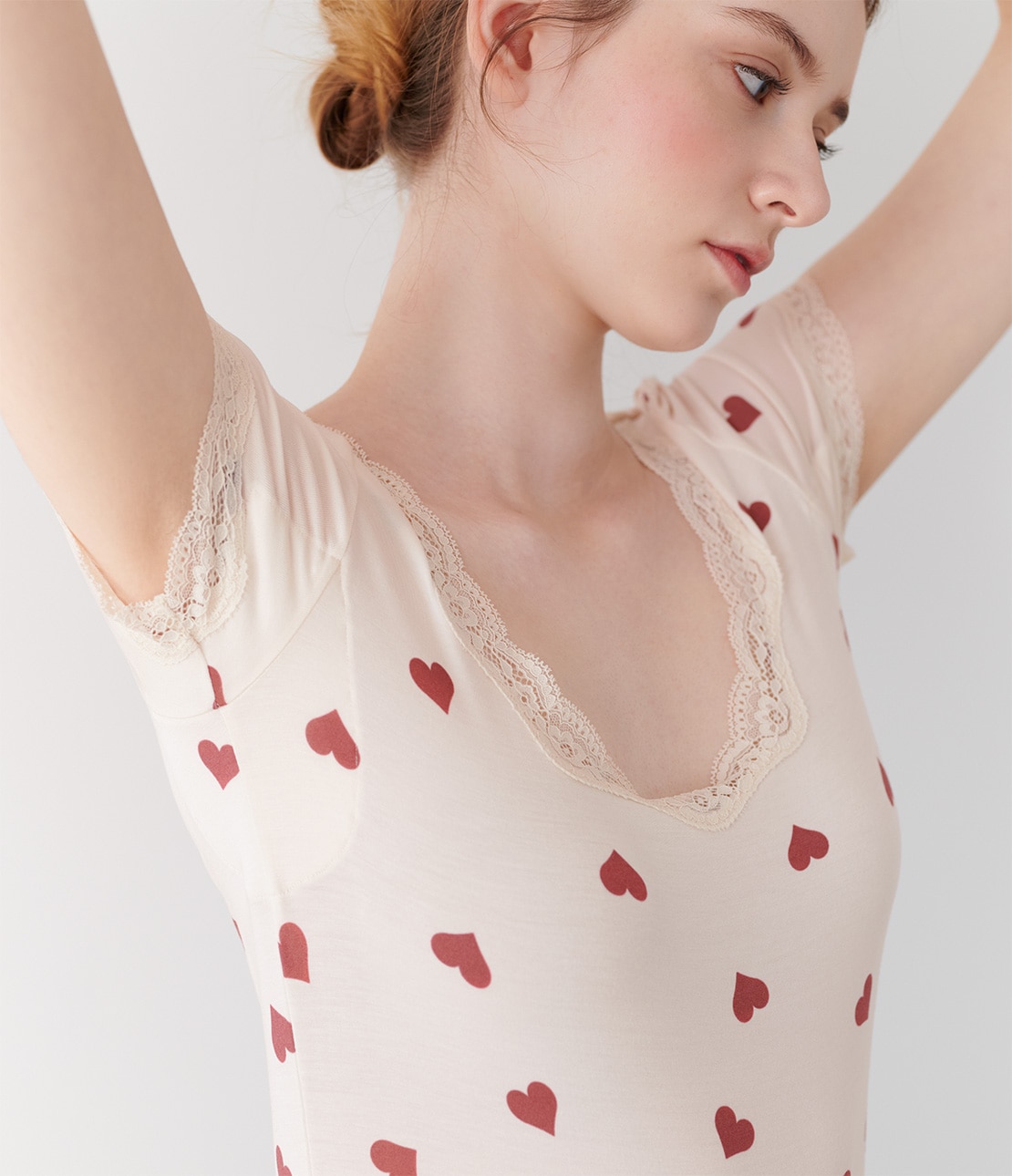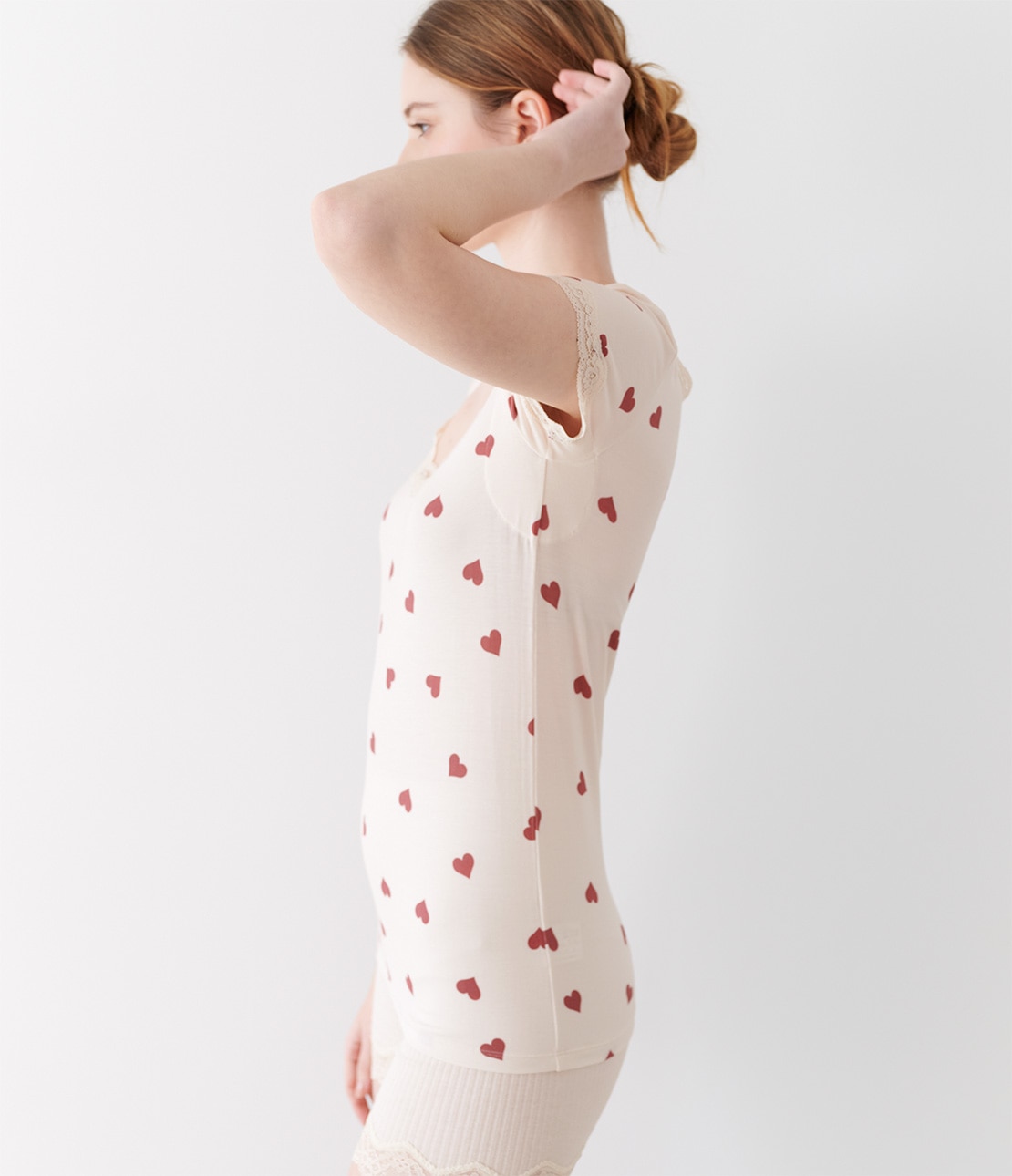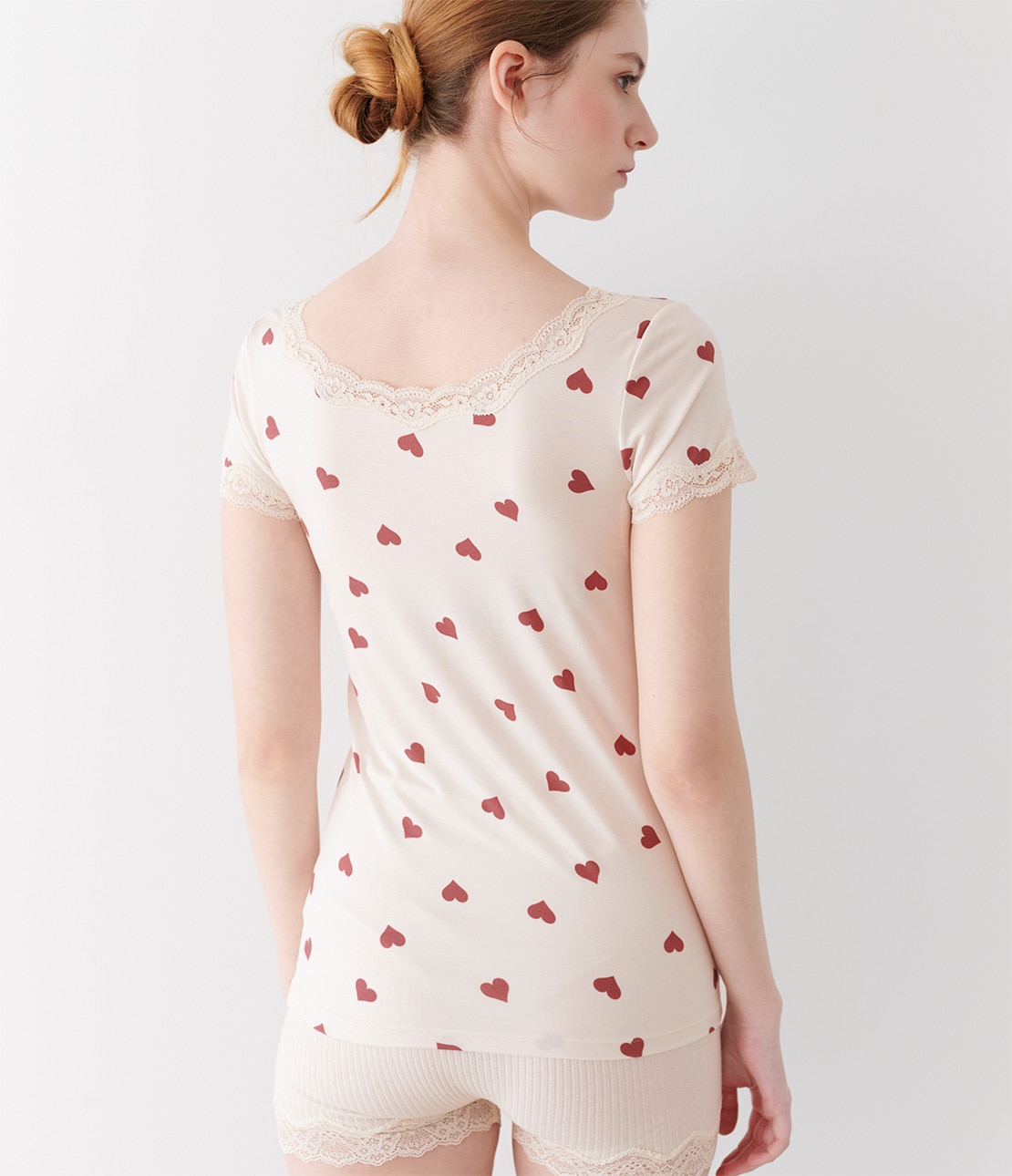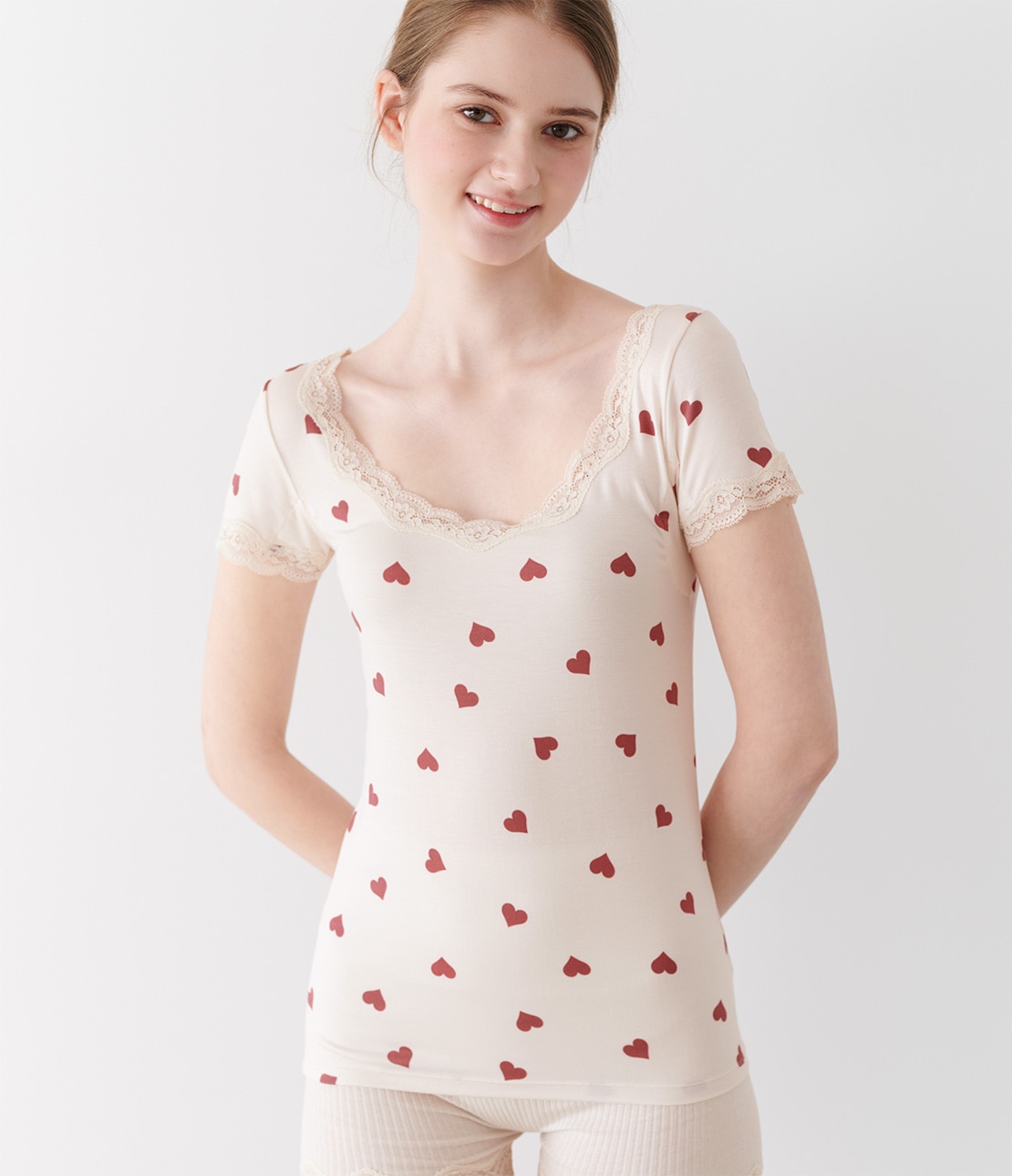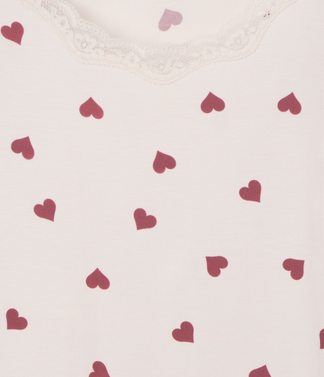 アイボリーの身生地に、落ち着いたレッドのハート柄を散らしてキュート。ネックのストレッチレースもアイボリー。