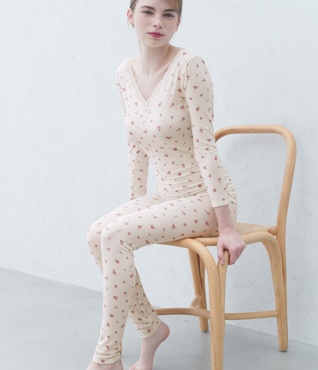 薄手のレーヨンベア天竺はとろみがあって伸びが良く、しっとり肌に吸い付くようにフィット。着ぶくれせず、肌と生地の間にすき間ができないからあたたかさを逃しにくい。さらに乾燥が気になる季節に嬉しい保湿加工付き。