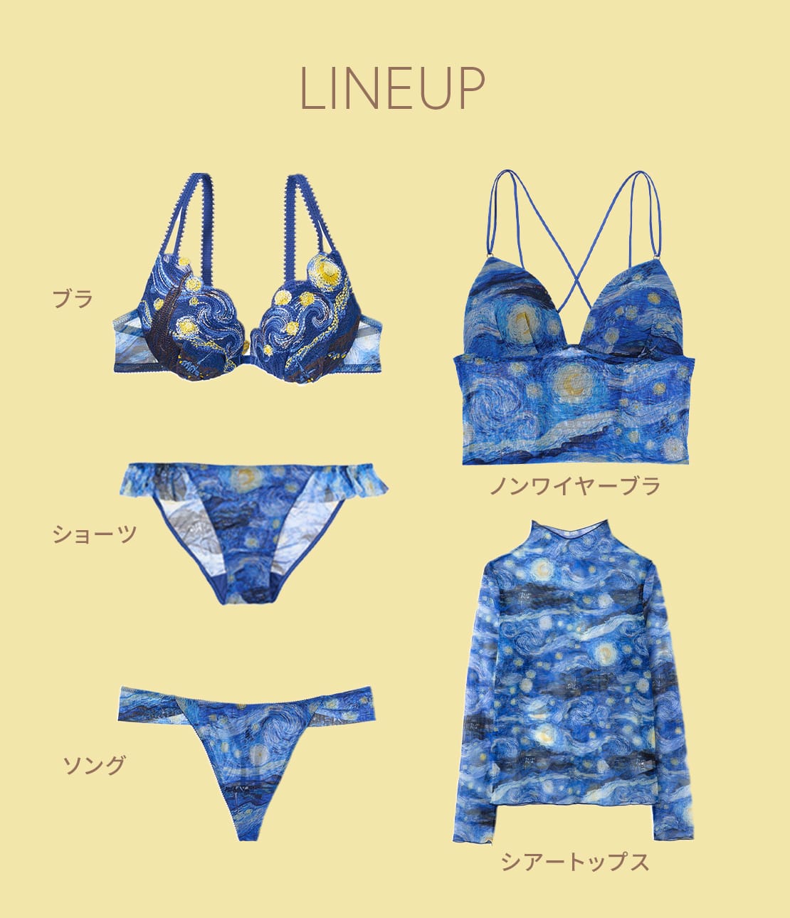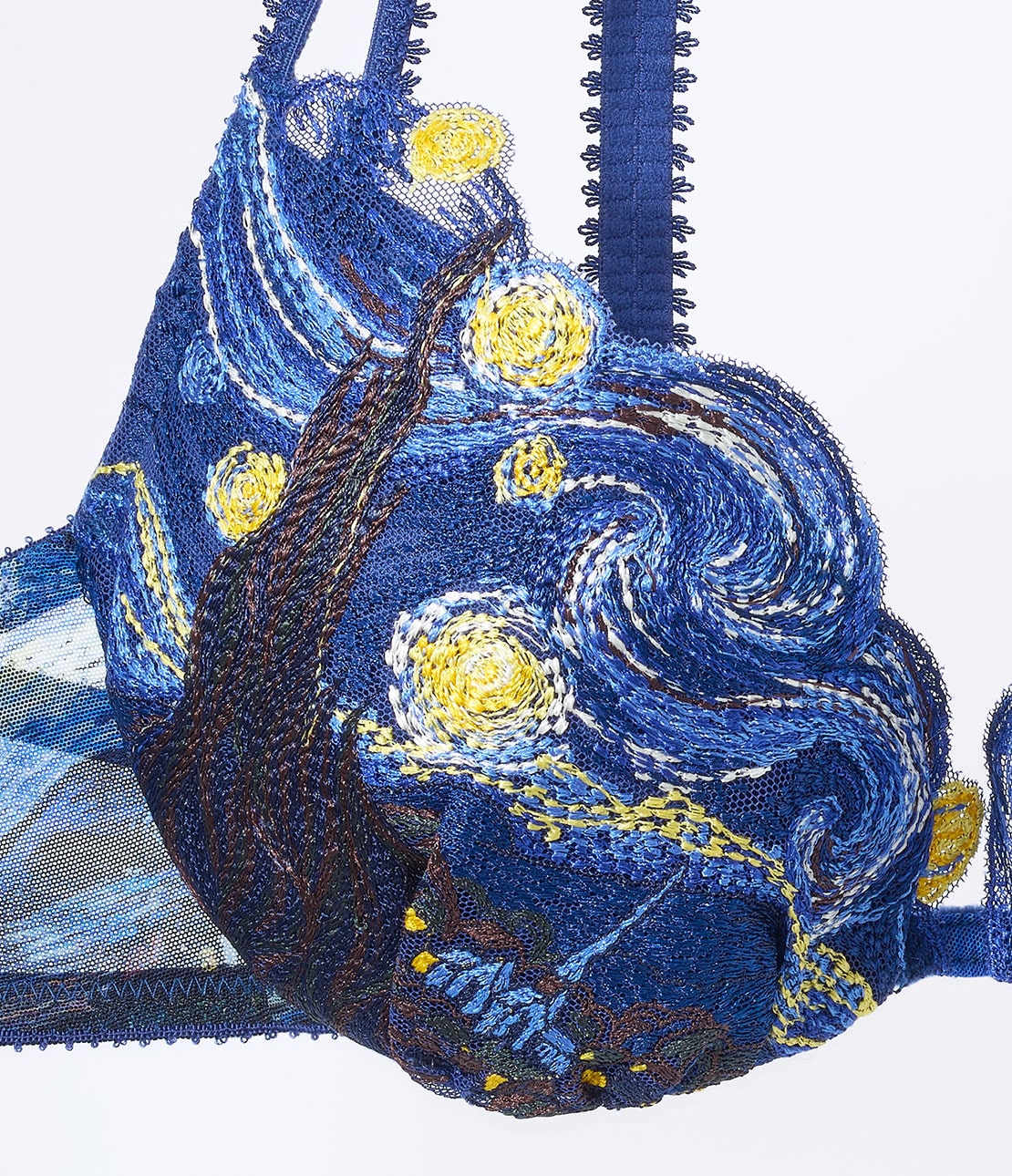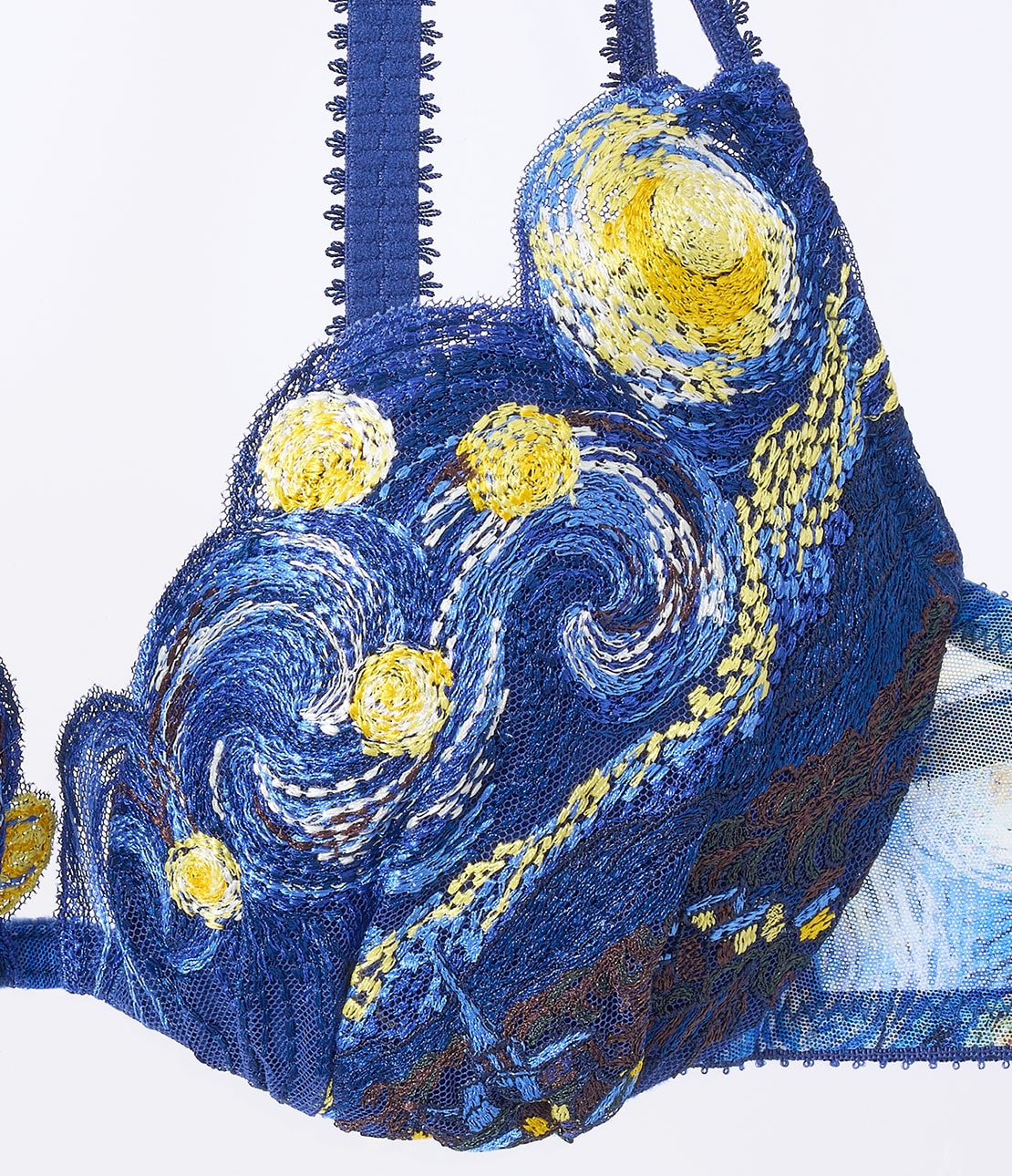 世界中で絶大な人気を誇る後期印象派の巨匠、フィンセント・ファン・ゴッホの油彩画『アイリス』がモチーフ。カップは鮮やかな青のアイリスを表現した刺しゅうレース。オリジナル作品の構図を生かし、右カップには黄色や白の花もあしらってアシンメトリーな仕上がり。