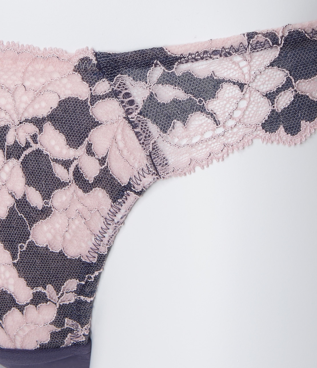 ・透け感のある編み柄の部分と、光沢のあるサテン調の部分とのコントラストが印象的なストレッチラッセルレース。