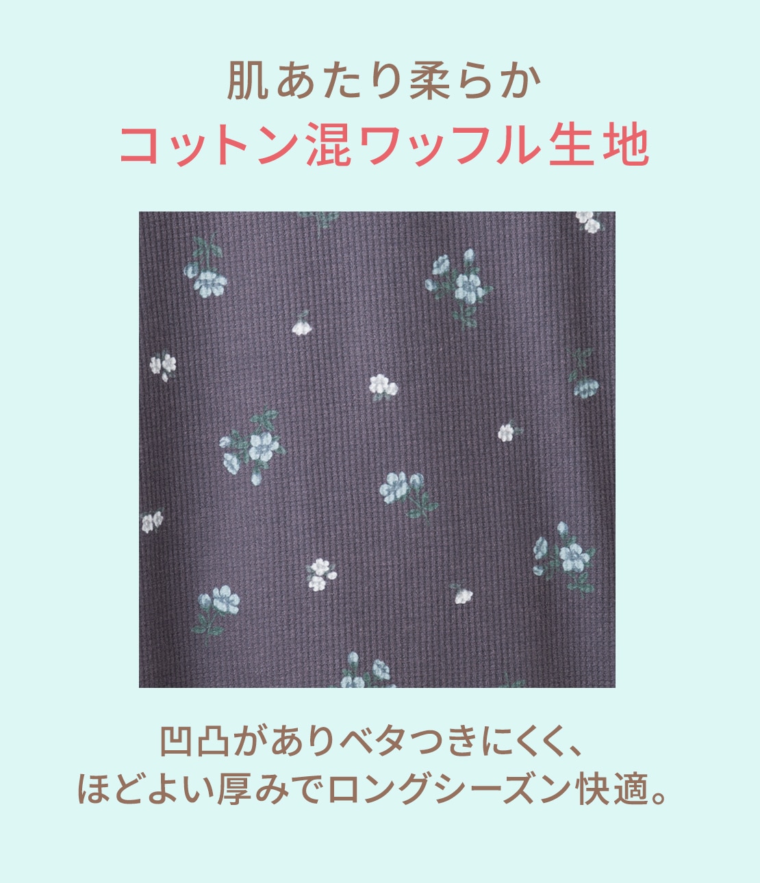 ・ワッフルのような凹凸のあるコットン混生地が肌ざわり良く、定番人気。