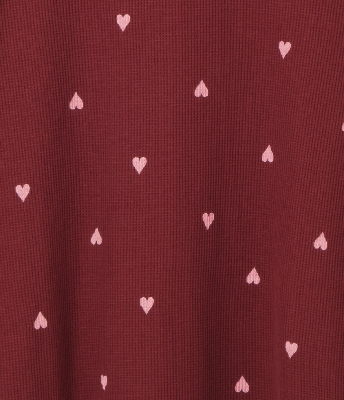 ボルドー系の落ち着いたレッド地に、ライトピンクのハートを散らしてキュート。袖口や腹巻き部、ステッチもライトピンク。