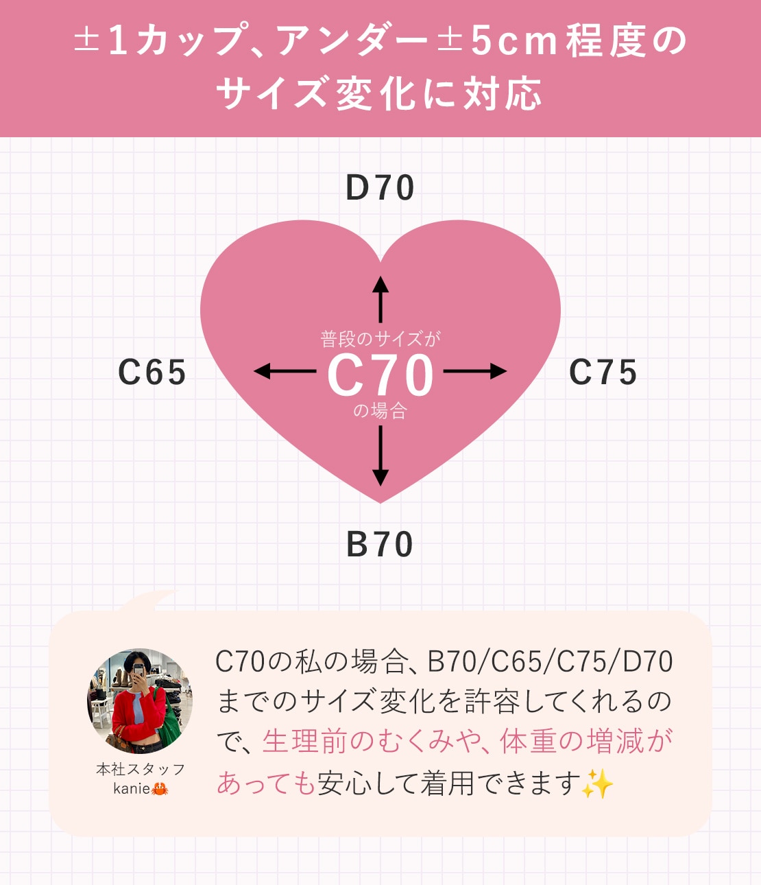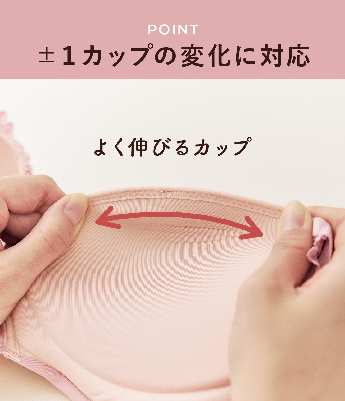 女性周期やコンディションにより日々変化するバスト。胸とカップのすき間やくい込みなど、ブラの着け心地にストレスを感じている人に!カップもサイドベルトもよく伸びて±1カップ、アンダー±5cmのサイズ変化を許容。どんな日もぴたっと気持ち良くジャストフィットします。