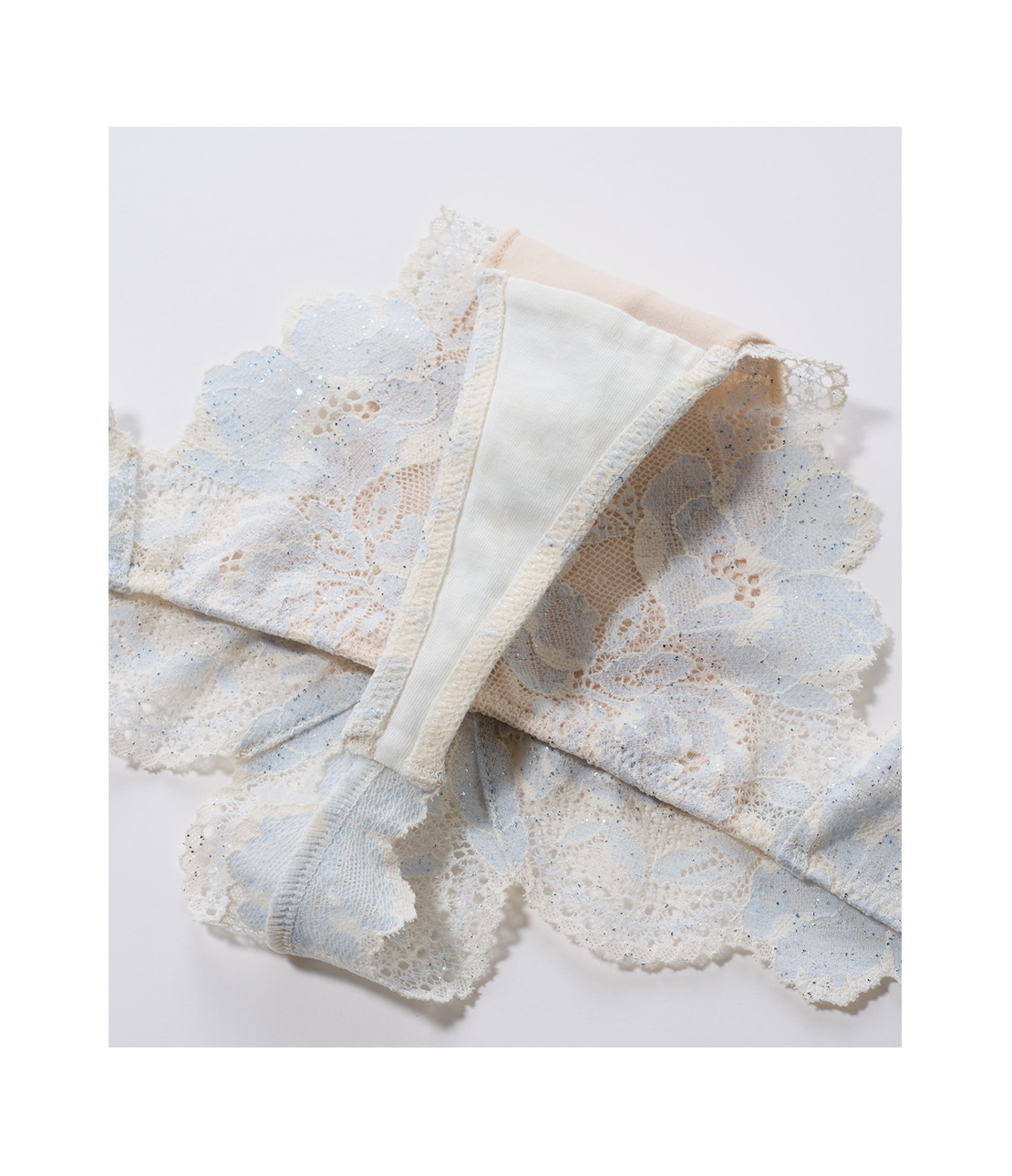 ホワイト×ブルーの2色レースに、メタリックブルーの箔プリントを施したスペシャルカラー。ほのかにまたたく上品な輝きで、特別なシーンはもちろん日常使いにも。