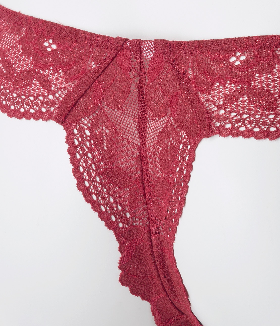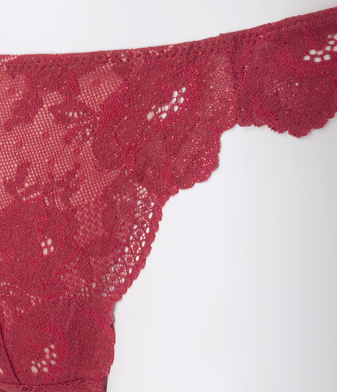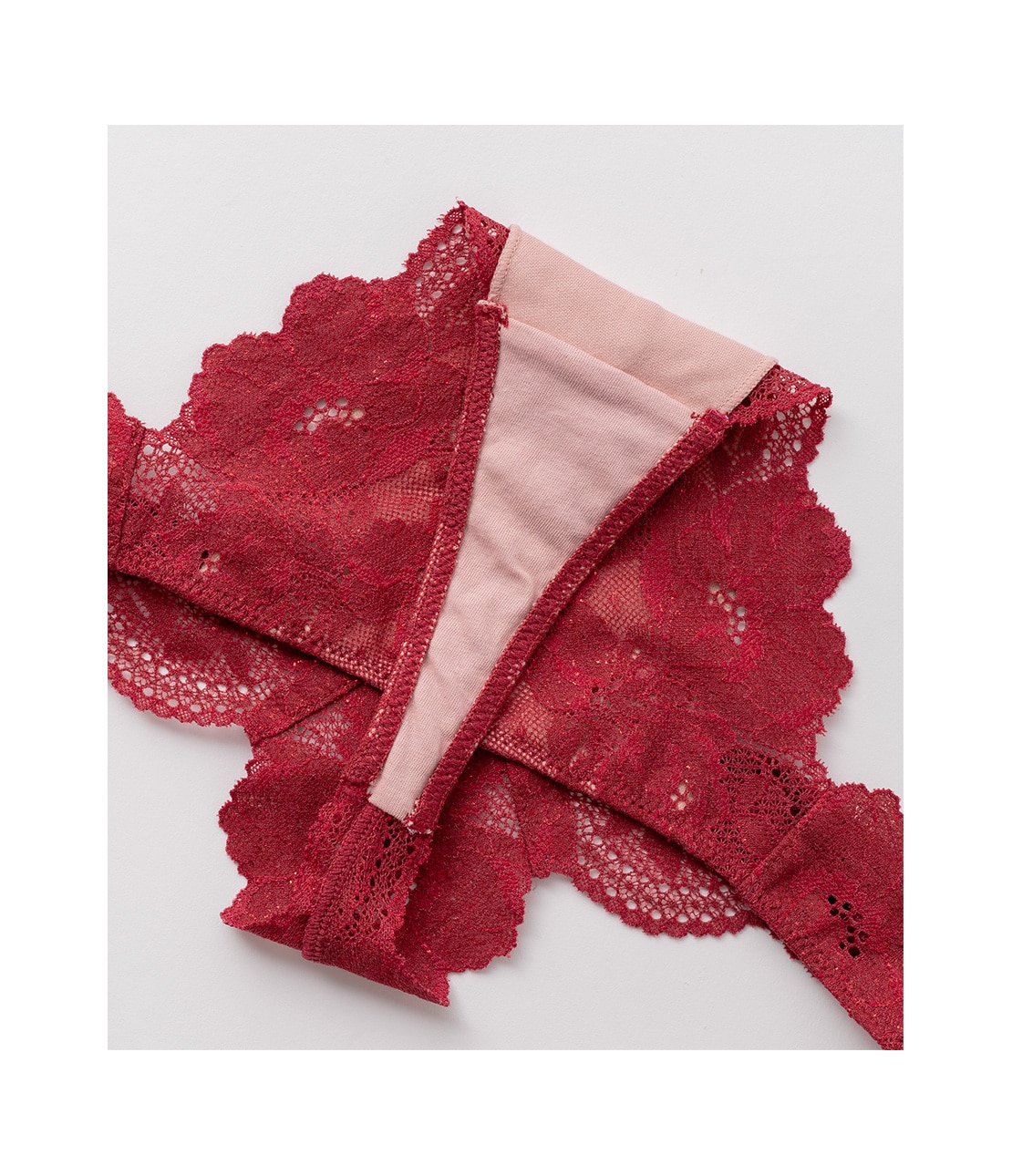落ち着いたレッド濃淡のレースに、メタリックレッドの箔プリントを施したスペシャルカラー。ほのかにまたたく上品な輝きで、ホリデイなどの特別なシーンはもちろん日常使いにも。
