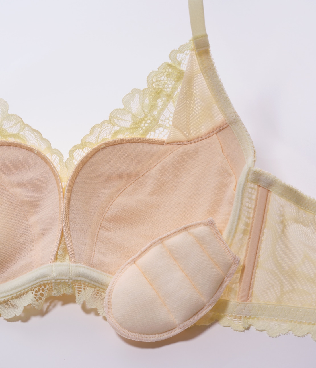 ・センターの低いL字型ワイヤーのカップと中厚手のパッドでボリュームを中央へと寄せ集め、谷間をメイク。