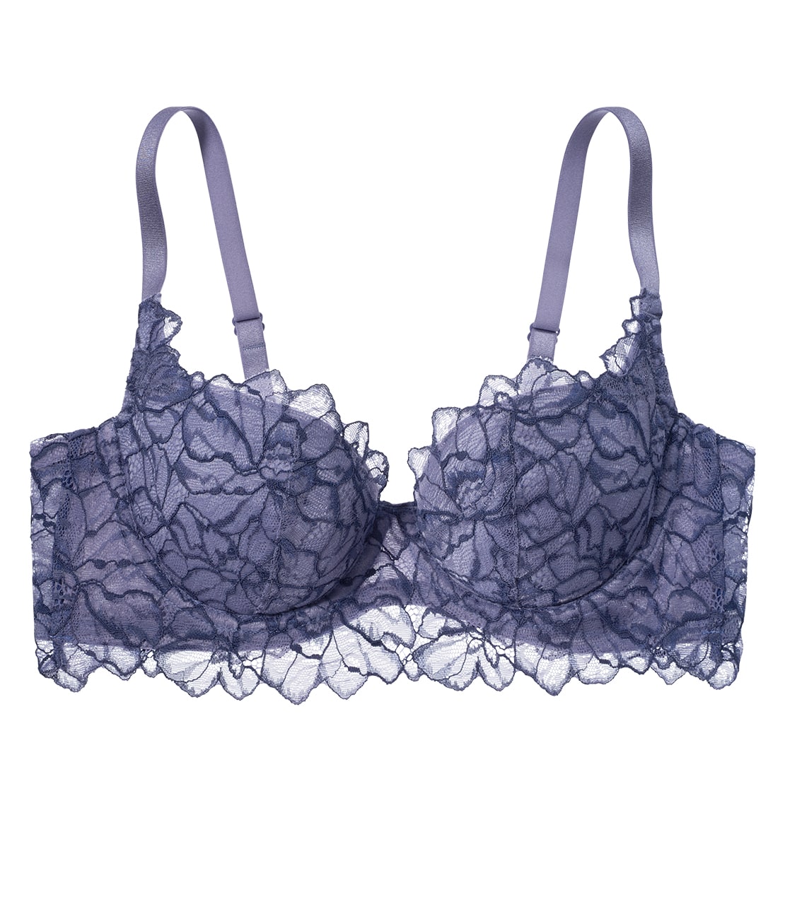 花のしずくをモチーフにした、大柄の線画調ストレッチレースを背中まで贅沢に。花びらのかたちのスカラップが、ネックラインやアンダーバストを優雅にふちどります。カップのサイド側がストラップ付け根まで立ち上がった、リフトアップ効果の高いパターン。厚めのパッドでボリュームを足しながら下からバストを持ち上げ、自然なふくらみのあるデコルテをメイクします。上カップ内側にはすべり止め生地を配し、持ち上げたバストのズレを防止。