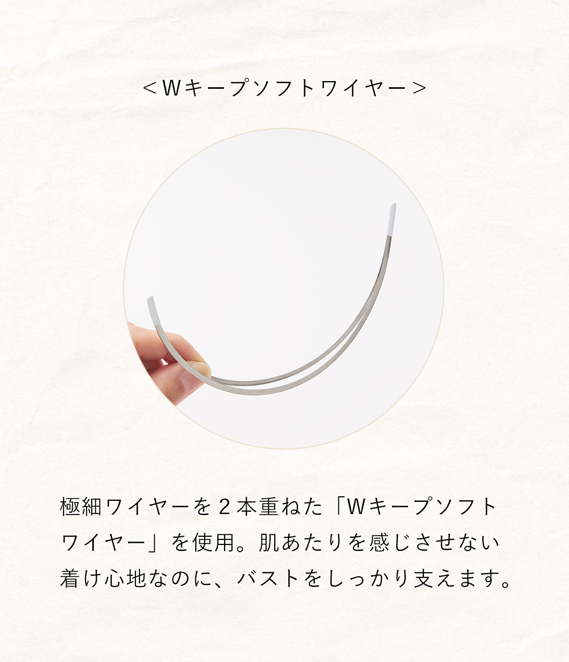 ●薄いワイヤーを2本重ねた「Wキープソフトワイヤー」を使用。柔軟にボディに沿って着け心地が優しいのに、バストメイクをしっかりキープできます。