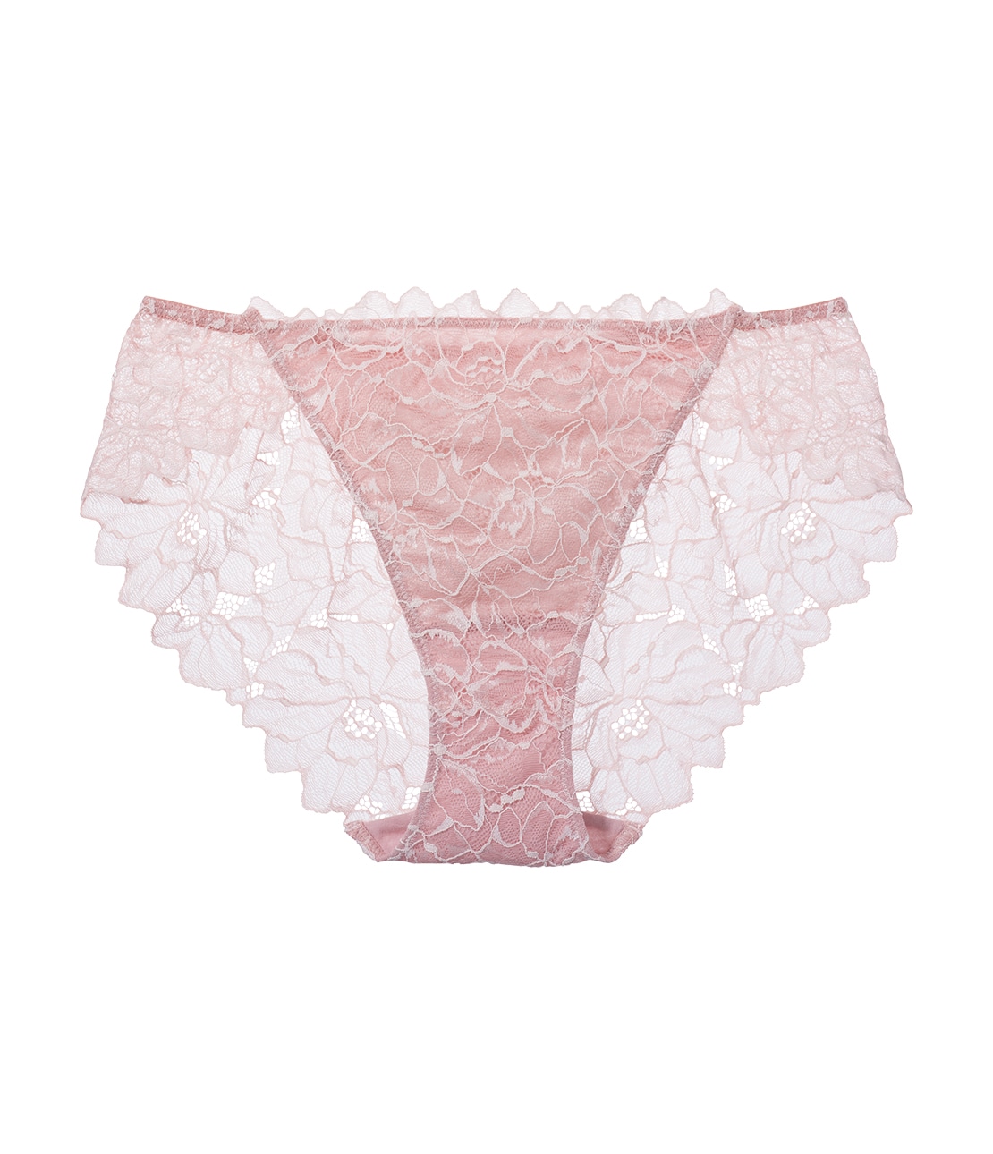 大輪の花々で埋め尽くされた線画調ストレッチレースをフルに使用。フロントにはトリコットを裏打ちして透けを防止、バックはレース1枚のみ。フロントウエストとバック脚ぐりは、花びらの形を描く優美なスカラップを生かし、洋服にラインも映りにくい。