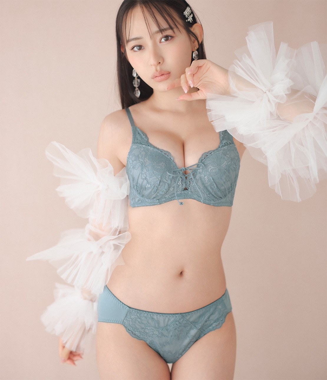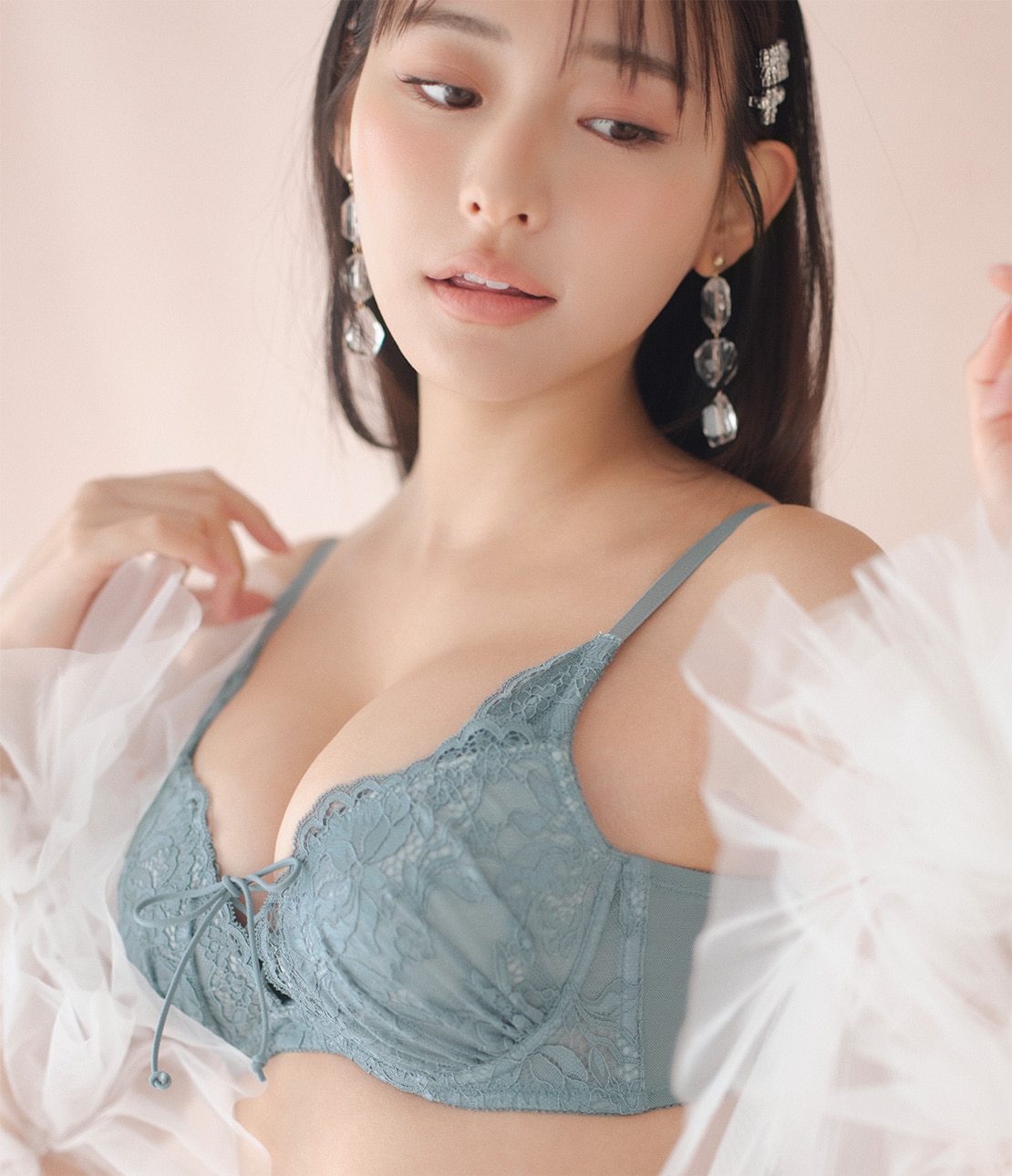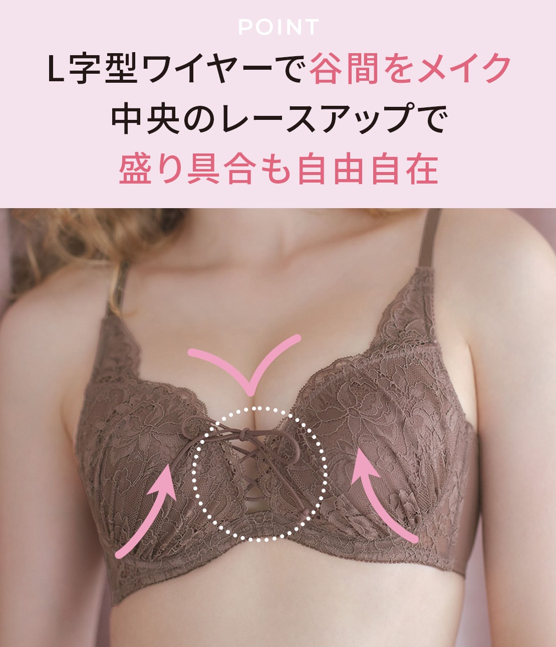 ・中央のレースアップで、谷間の寄せ具合を調節できる。