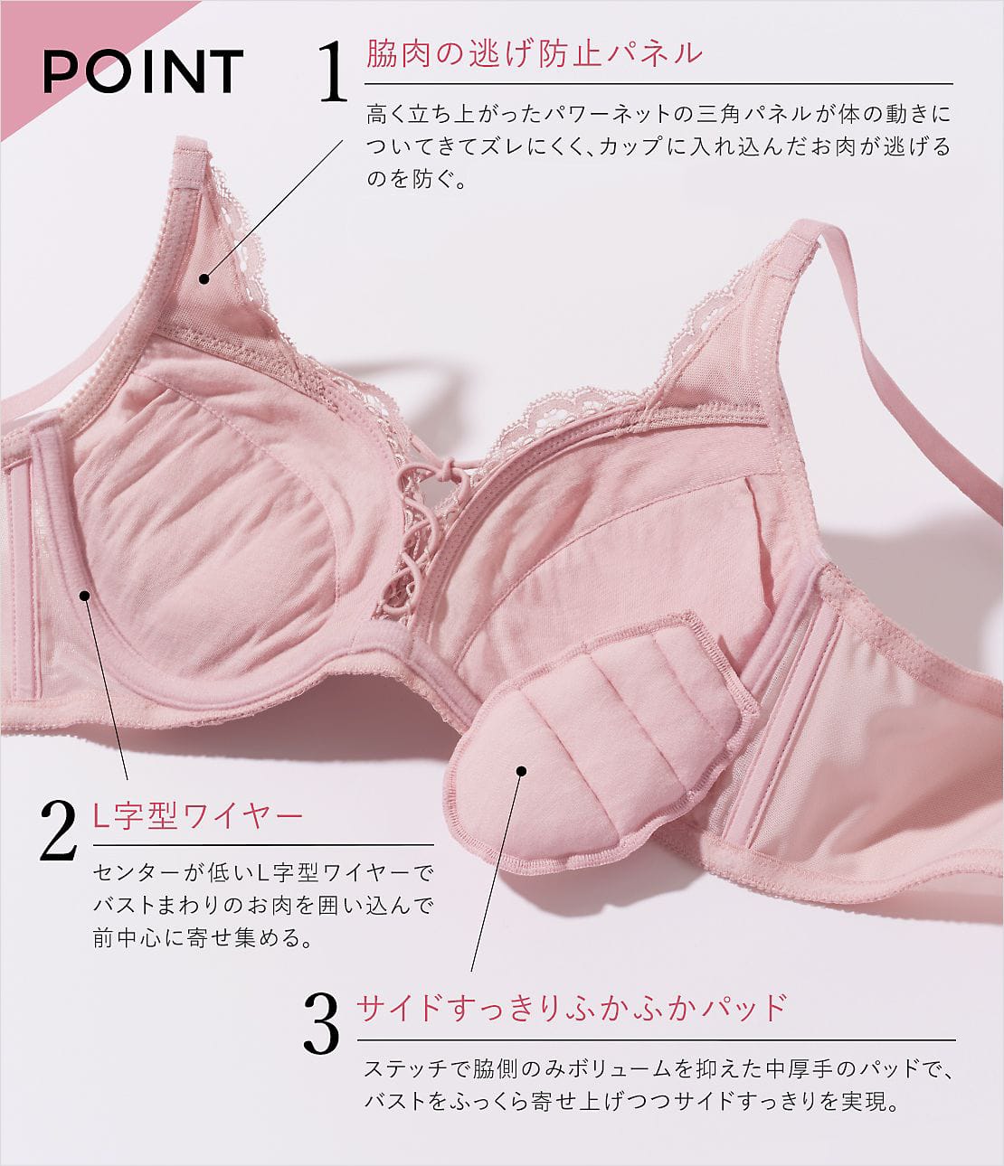 ・脇高設計のカップで、サイドにはみ出しがちなお肉をすっきり整える。