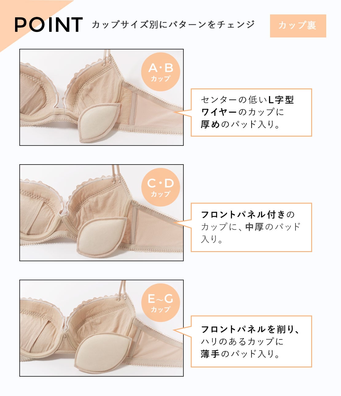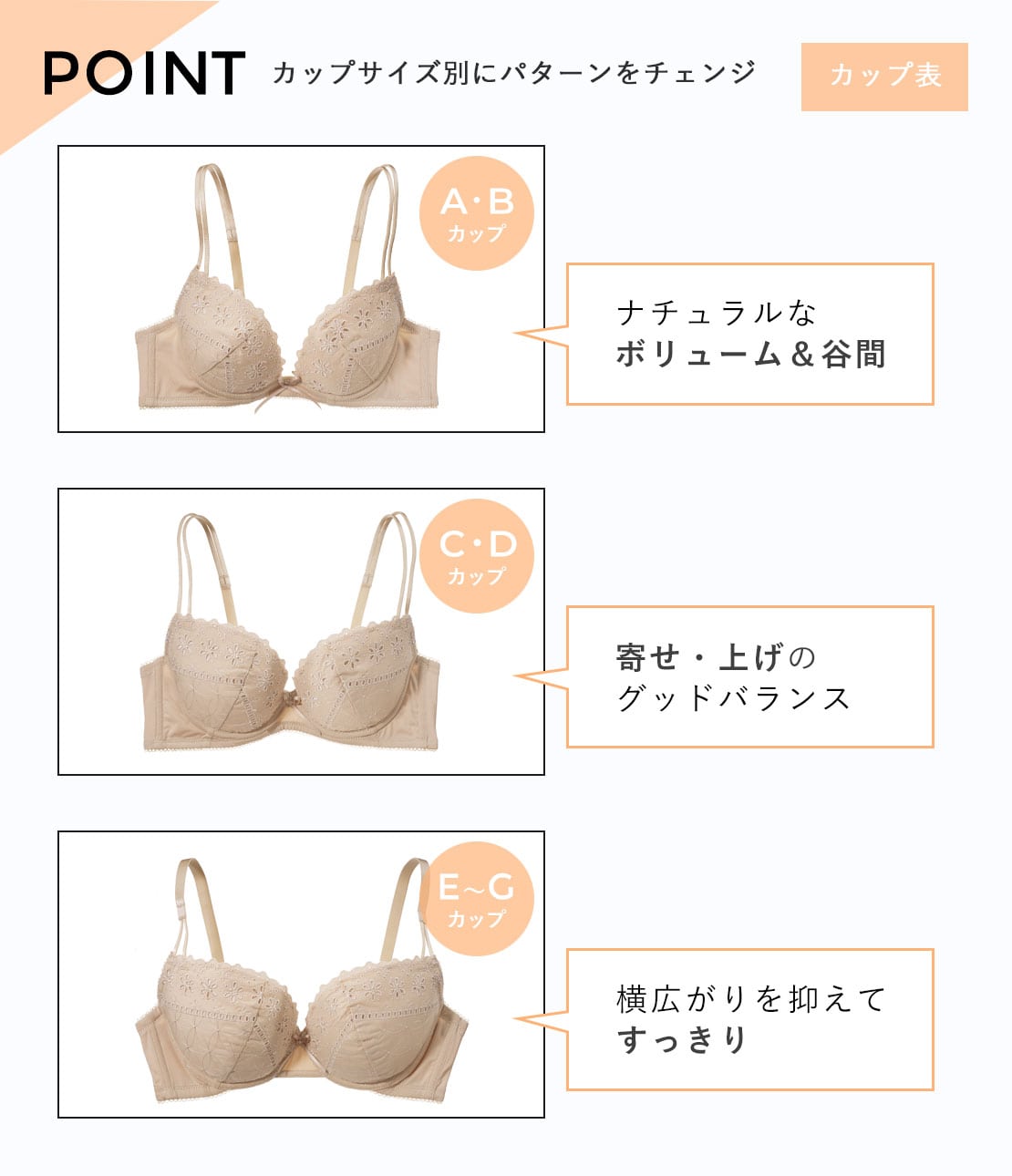 カップを飾るのは、コットン混でナチュラルな表情のアイレットレース。落ち着いたカラーが可愛らしさに大人っぽさをプラスしています。カップサイズによってパターンを変え、小胸さんからグラマーさんまでそれぞれのニーズに応えたバストメイク。A・Bカップはナチュラルにボリュームアップ、C・Dカップは程よい寄せ上げ、E~Gカップは横広がりを抑えすっきり。合わせる服を選ばない、バランスのいいバストラインに整えます。