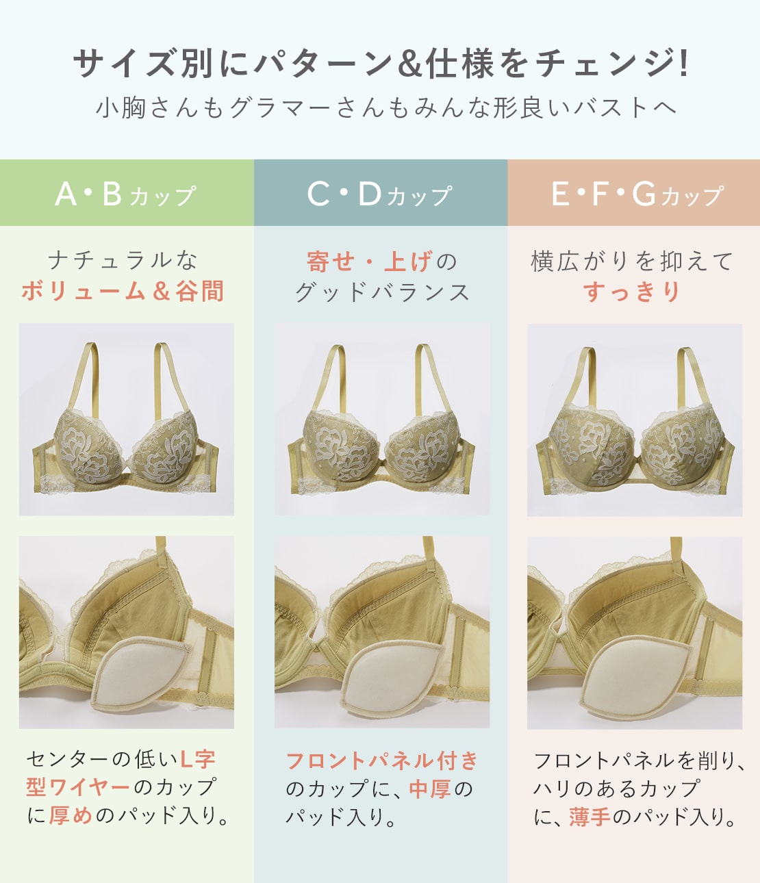 くっきりとしたタッチの花柄刺しゅうがレトロ&ロマンティック。くすんだ優しい色味の「ピンク」、トレンドカラーのピスタチオ「グリーン」、ベージュカラーを背景にしたシックな「ブラック」、それぞれに異なる魅力の3色展開です。カップサイズによってパターンを変え、小胸さんからグラマーさんまでそれぞれのニーズに応えたバストメイク。A・Bカップはナチュラルにボリュームアップ、C・Dカップは程よい寄せ上げ、E~Gカップは横広がりを抑えすっきり。合わせる服を選ばない、バランスのいいバストラインに整えます。