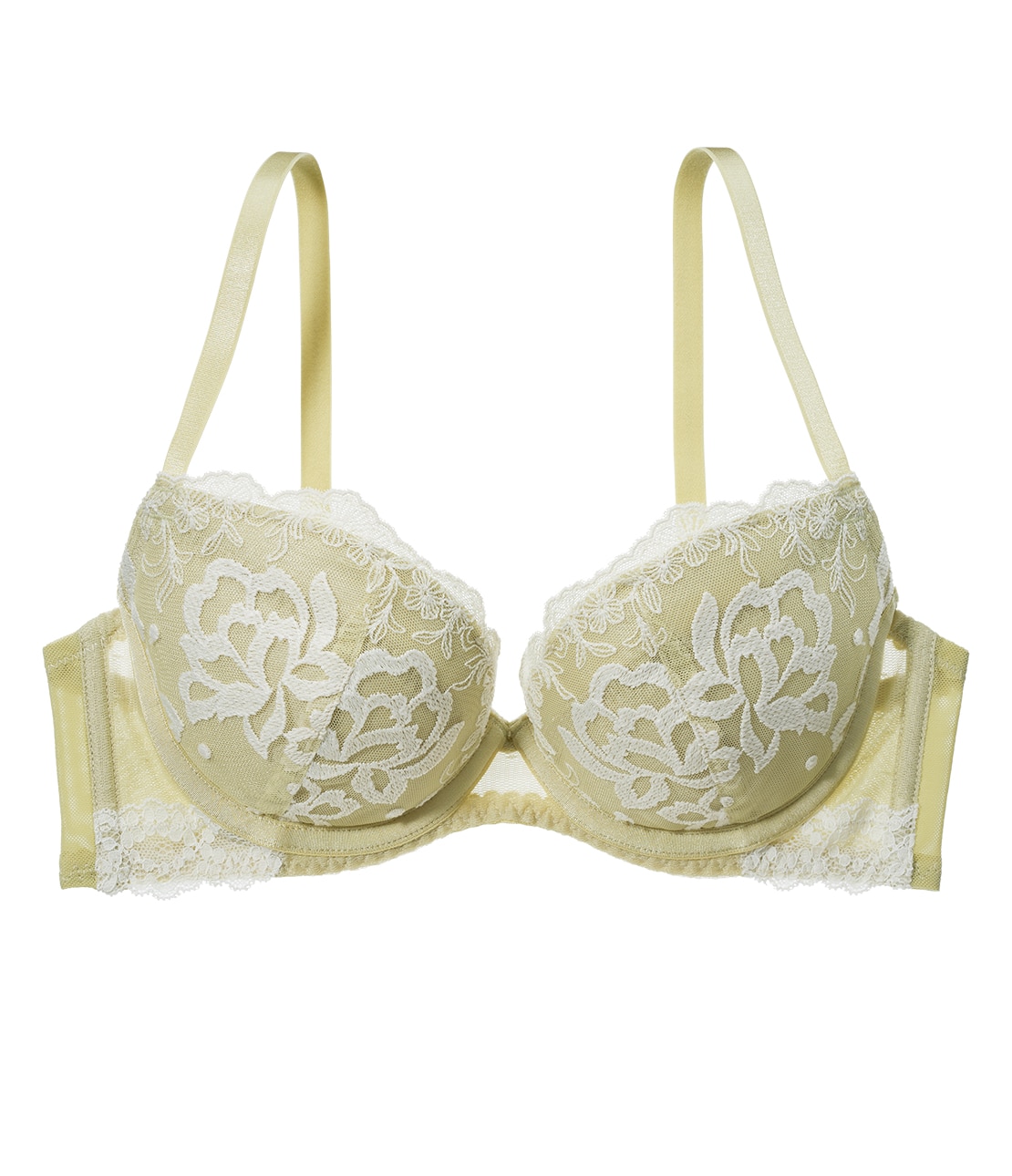 くっきりとしたタッチの花柄刺しゅうがレトロ&ロマンティック。くすんだ優しい色味の「ピンク」、トレンドカラーのピスタチオ「グリーン」、ベージュカラーを背景にしたシックな「ブラック」、それぞれに異なる魅力の3色展開です。カップサイズによってパターンを変え、小胸さんからグラマーさんまでそれぞれのニーズに応えたバストメイク。A・Bカップはナチュラルにボリュームアップ、C・Dカップは程よい寄せ上げ、E~Gカップは横広がりを抑えすっきり。合わせる服を選ばない、バランスのいいバストラインに整えます。