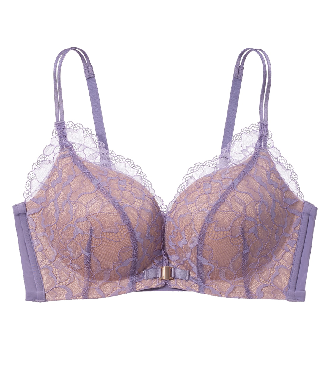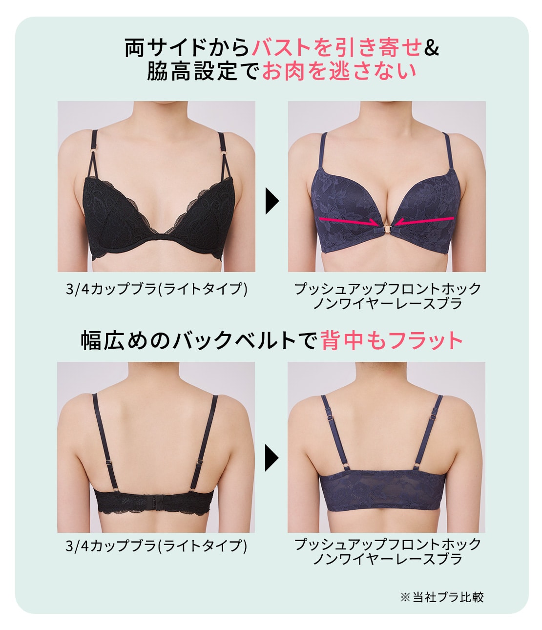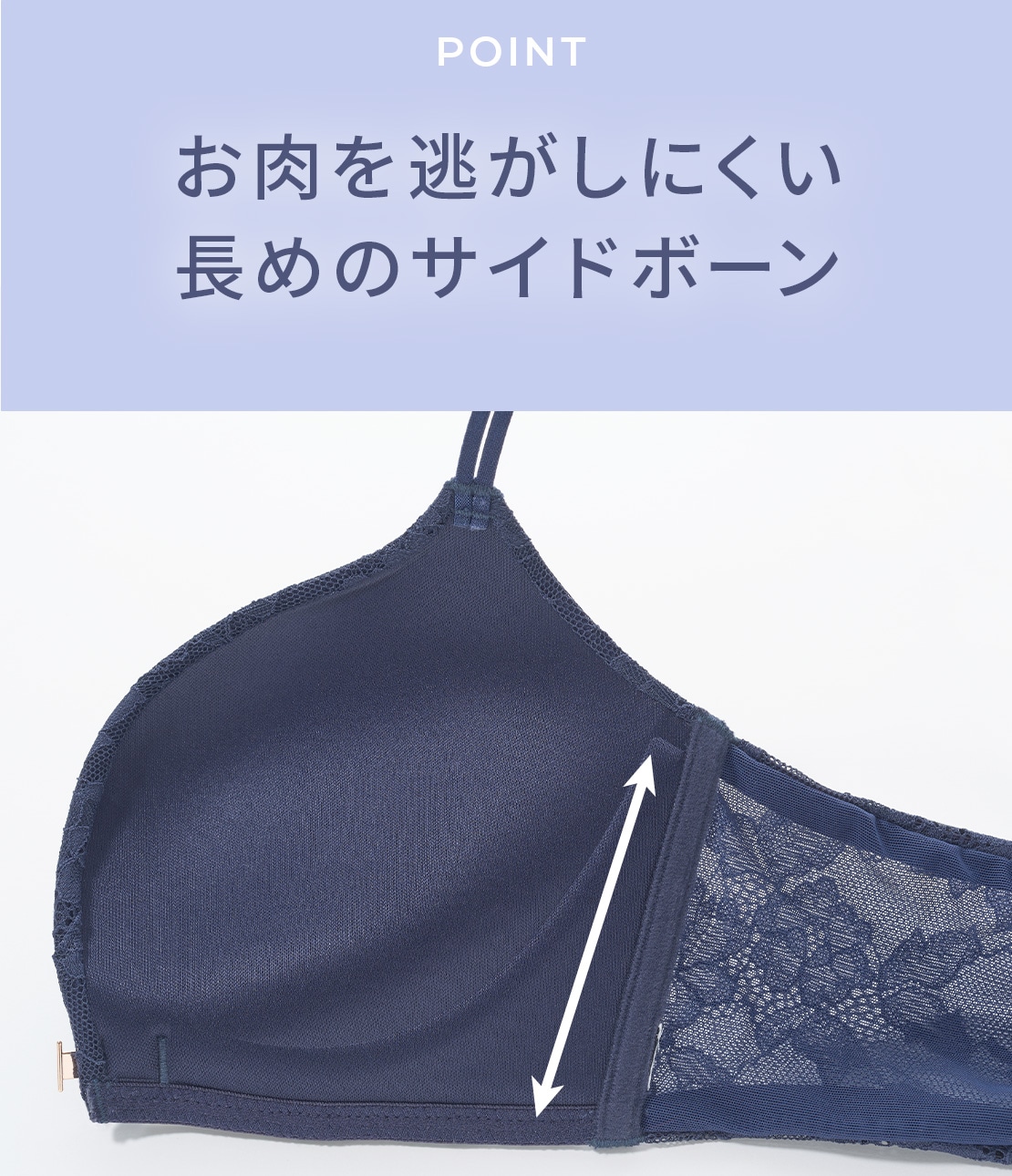 ・下厚カップでボリュームアップしつつ、脇高設計で脇肉をキャッチしてサイドから寄せ、盛り感のある谷間をメイク。