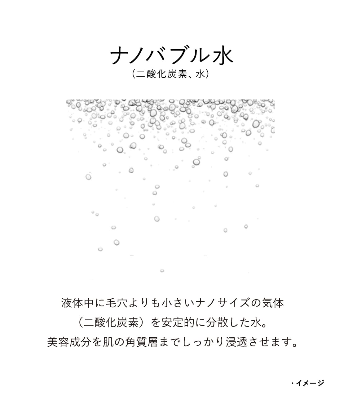 ・炭酸ナノバブル水(二酸化炭素)により、しっとりうるおった肌へと導く。