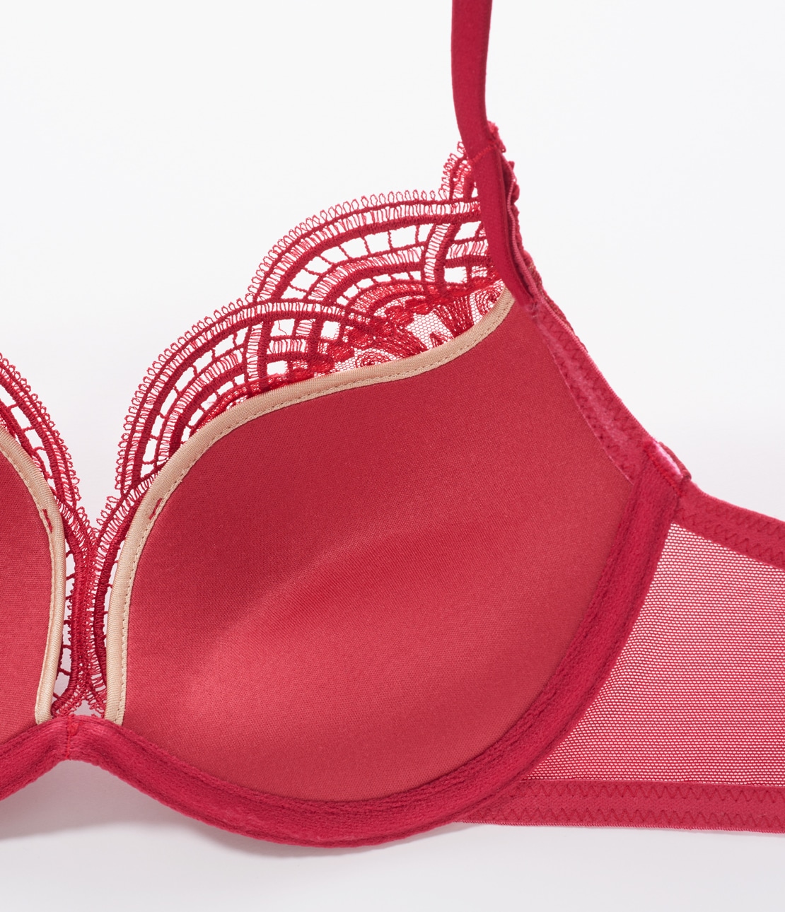 ・アーチ型の凝ったスカラップとシャンデリア柄で構成された、豪華でインポートライクな刺しゅうレースをカップに使用。