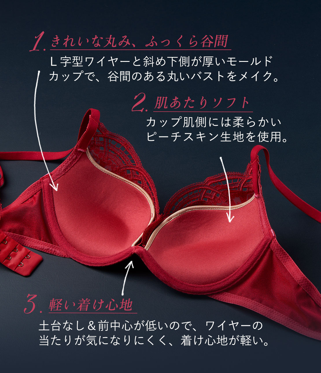 ・センターが低いL字型ワイヤーとセンター可動式パターンでバストを左右からすくい上げ、きれいな谷間をメイク。