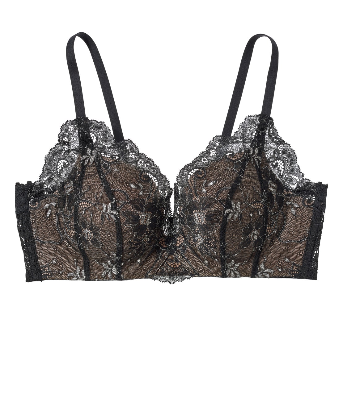 ・カップにはツートーンストレッチレースを縦長に配して豪華。ネックラインはレース1枚で透け感を生かし、軽やか