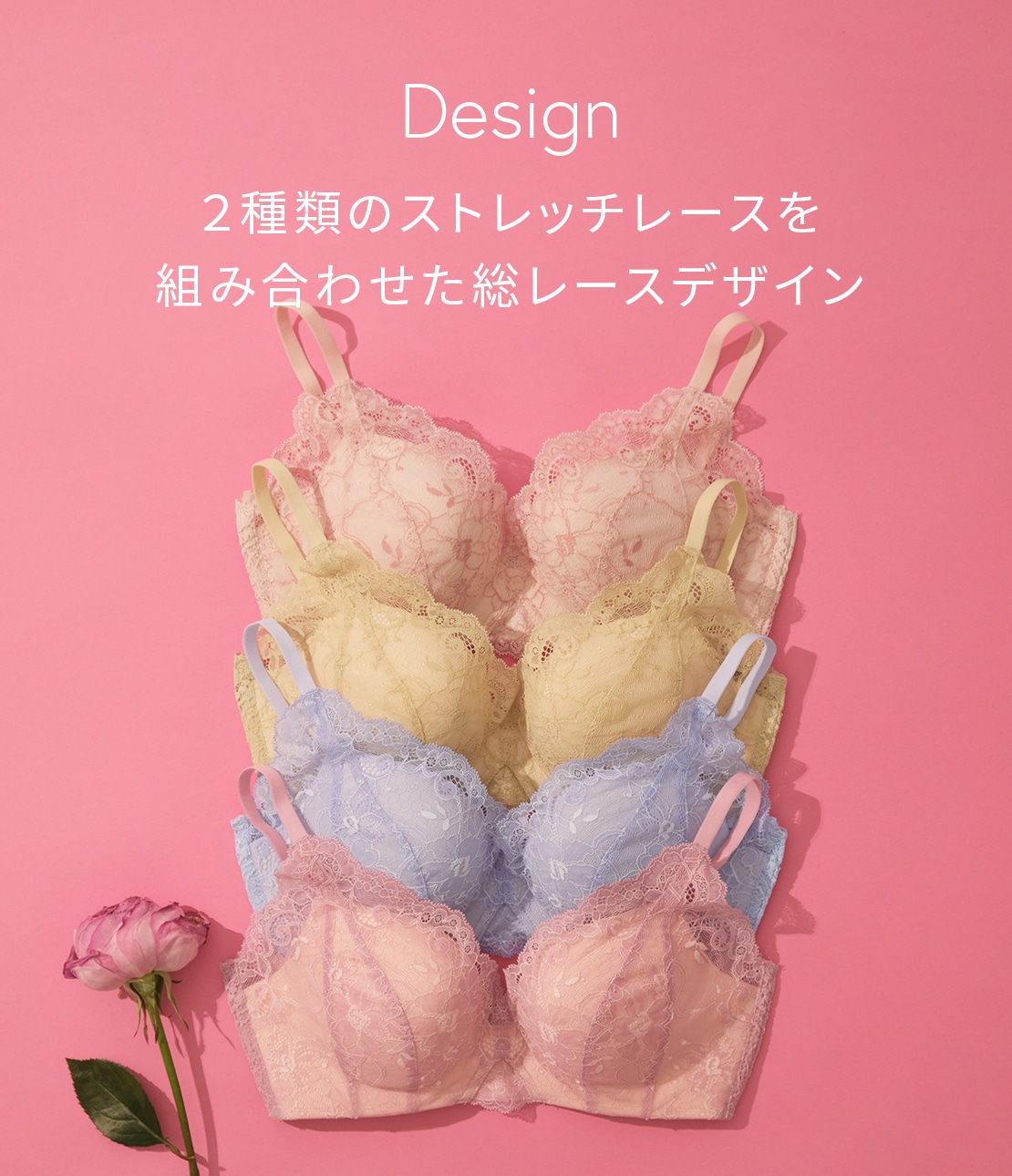 【ノンワイヤー】左右差・浮き・張りに対応。華やかな総レースの縦長カップデザイン。