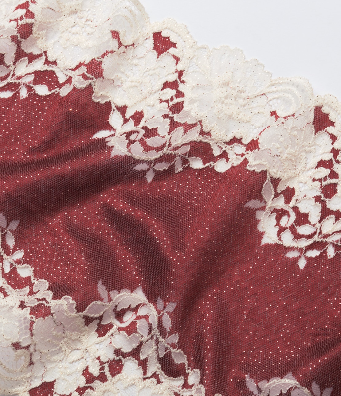 レースにピンクゴールドのラメプリントを施して、きらきらと輝く。華やかなレッド×アイボリーのツートーンカラーで、特別なシーンにもぴったり。