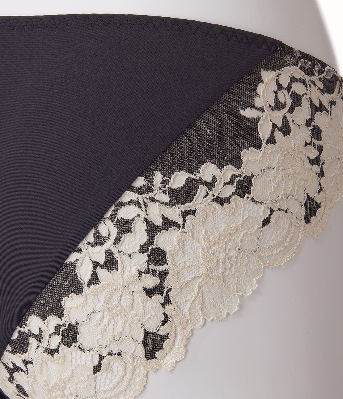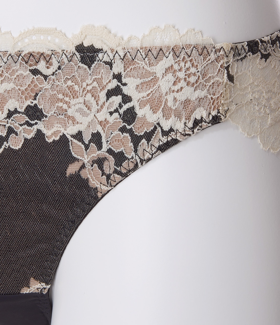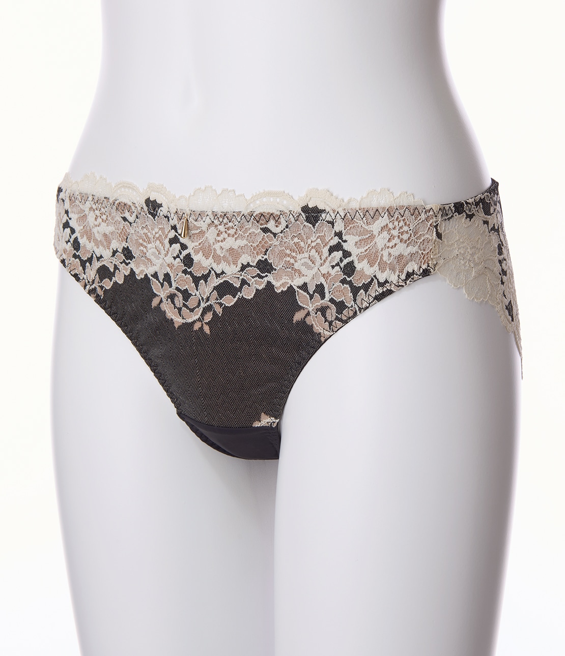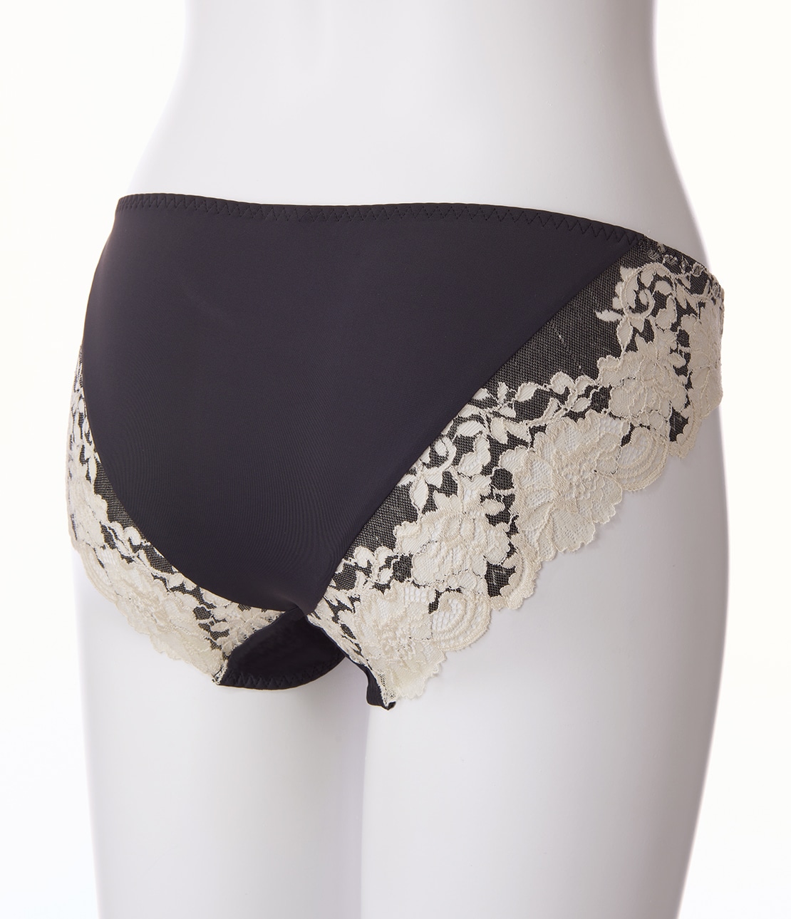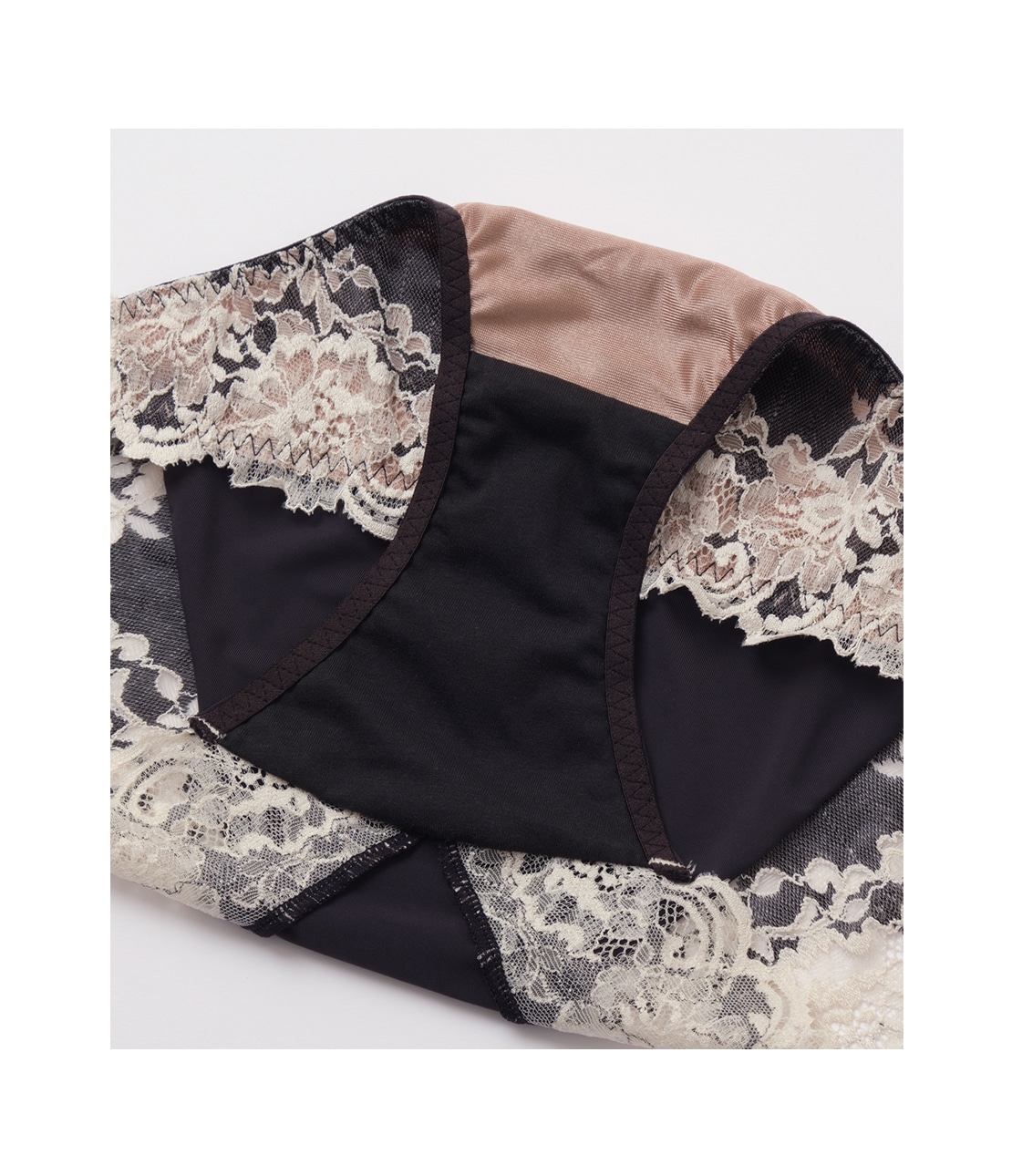 ・ふちは繊細な花柄、ベースは光沢ある生地調と、異なる質感を組み合わせた2色染めのストレッチレース。薄手生地を裏打ちして透けにくい。