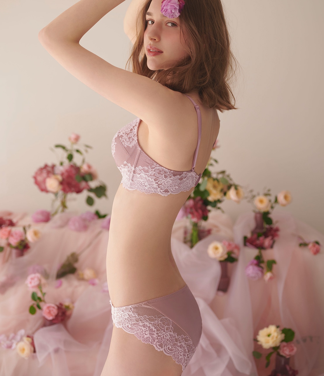 ・脚ぐりを幅広のストレッチレースに切り替え、後ろ姿が豪華。