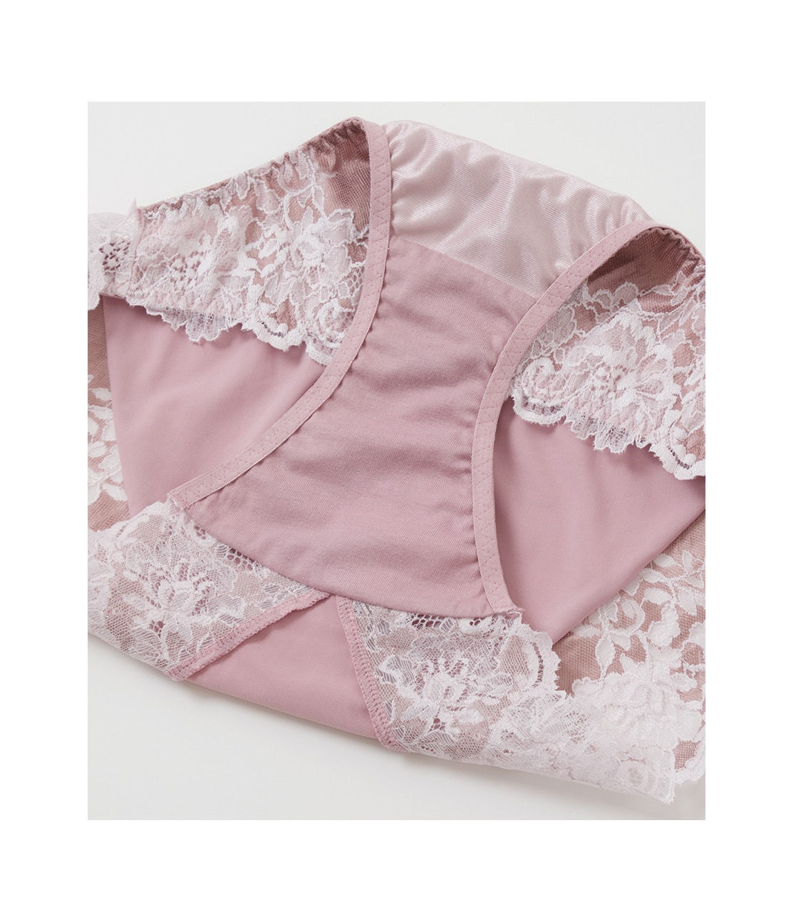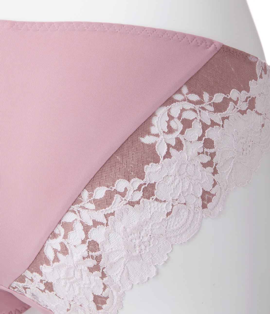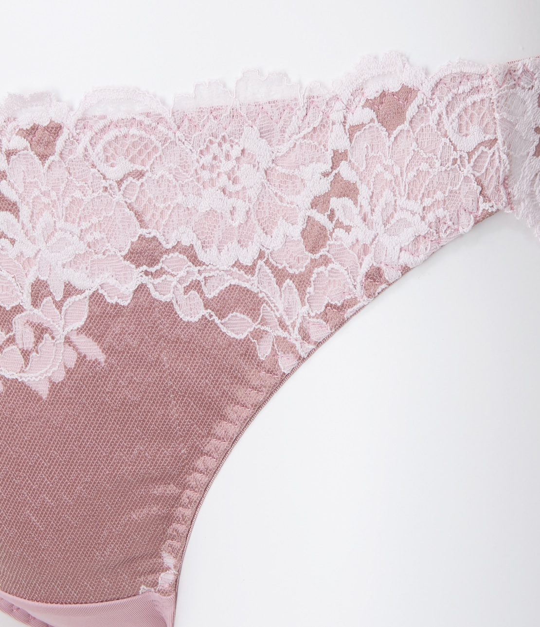 ・ふちは繊細な花柄、ベースは光沢ある生地調と、異なる質感を組み合わせた2色染めのストレッチレース。薄手生地を裏打ちして透けにくい。