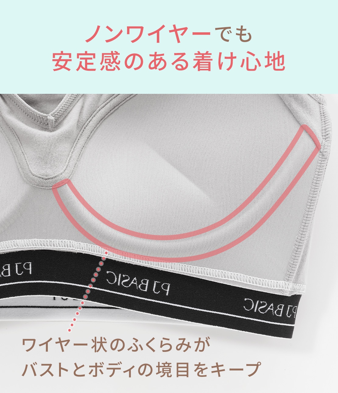 ・アンダーバストは一周、「PJ BASIC」のロゴ入りゴムテープ。伸びも戻りも良く、フィッティングがズレにくい