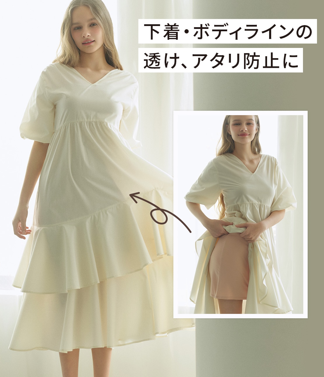 ・シアー素材の服を着る時に、下着やボディラインの透けを防止できるスリップ。