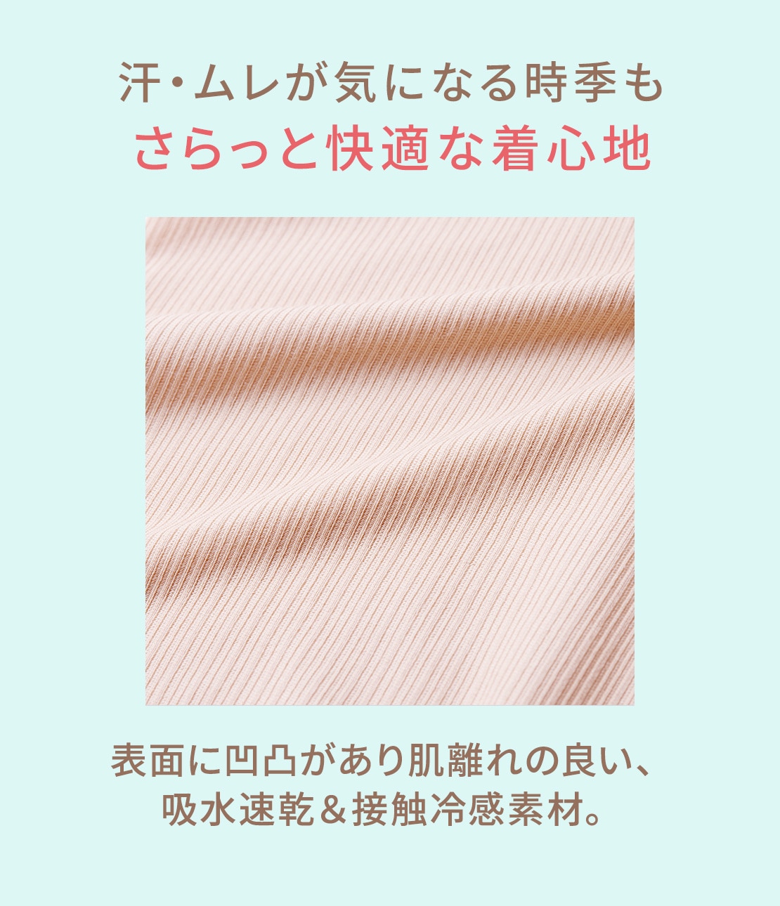 ・キャミソール部に、接触冷感機能のある吸水速乾素材を使用。着た瞬間からひんやり涼しく、脱ぐ時まで快適。