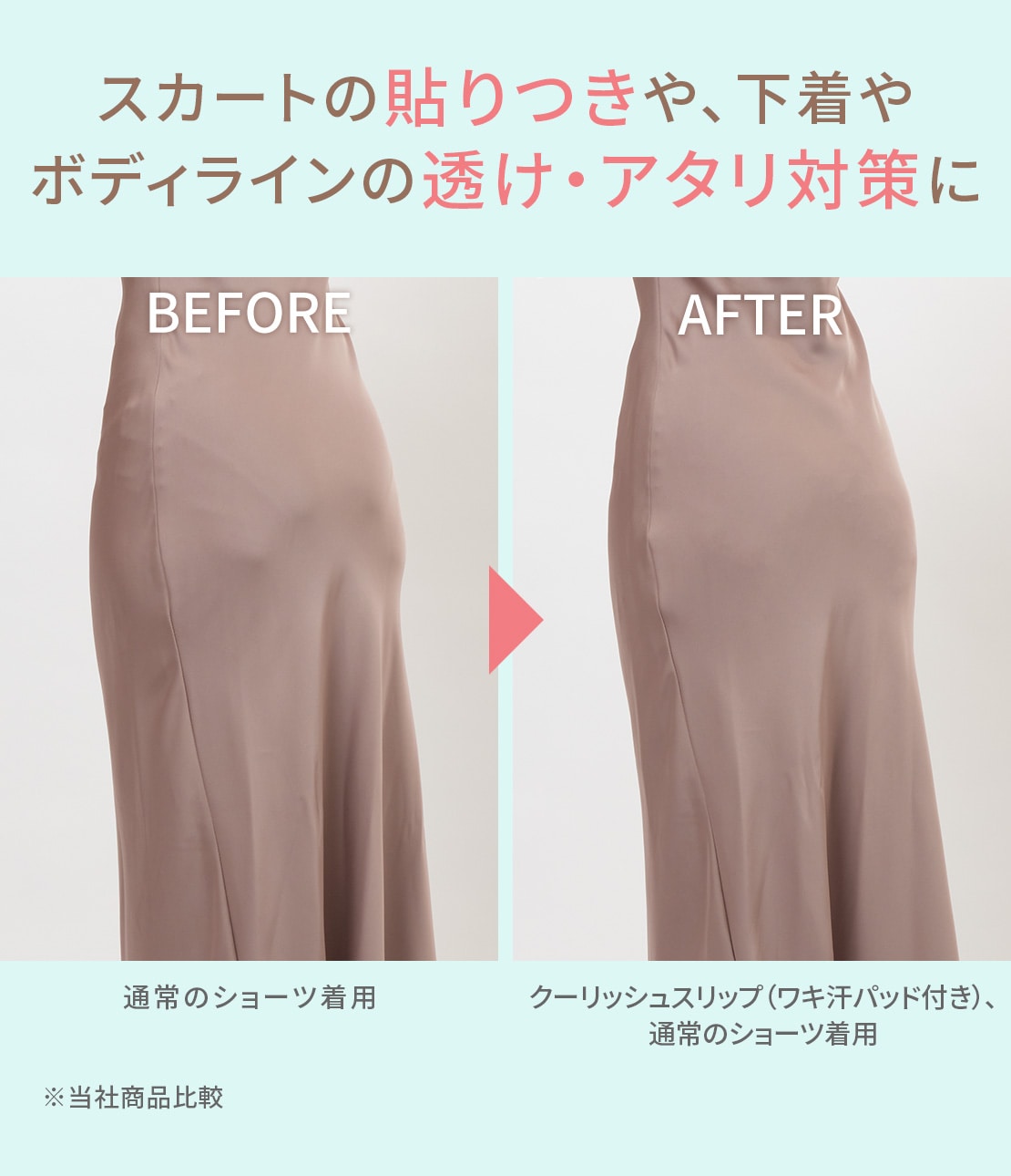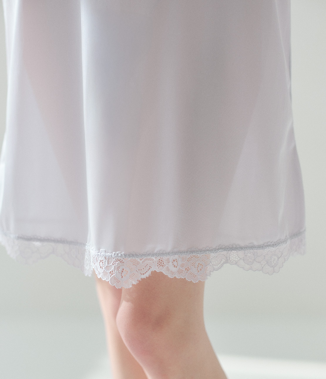 ・腰骨付近から下はなめらかな薄手生地に切り替え。透けを防ぎ、スカートのシルエットを美しく保つ。