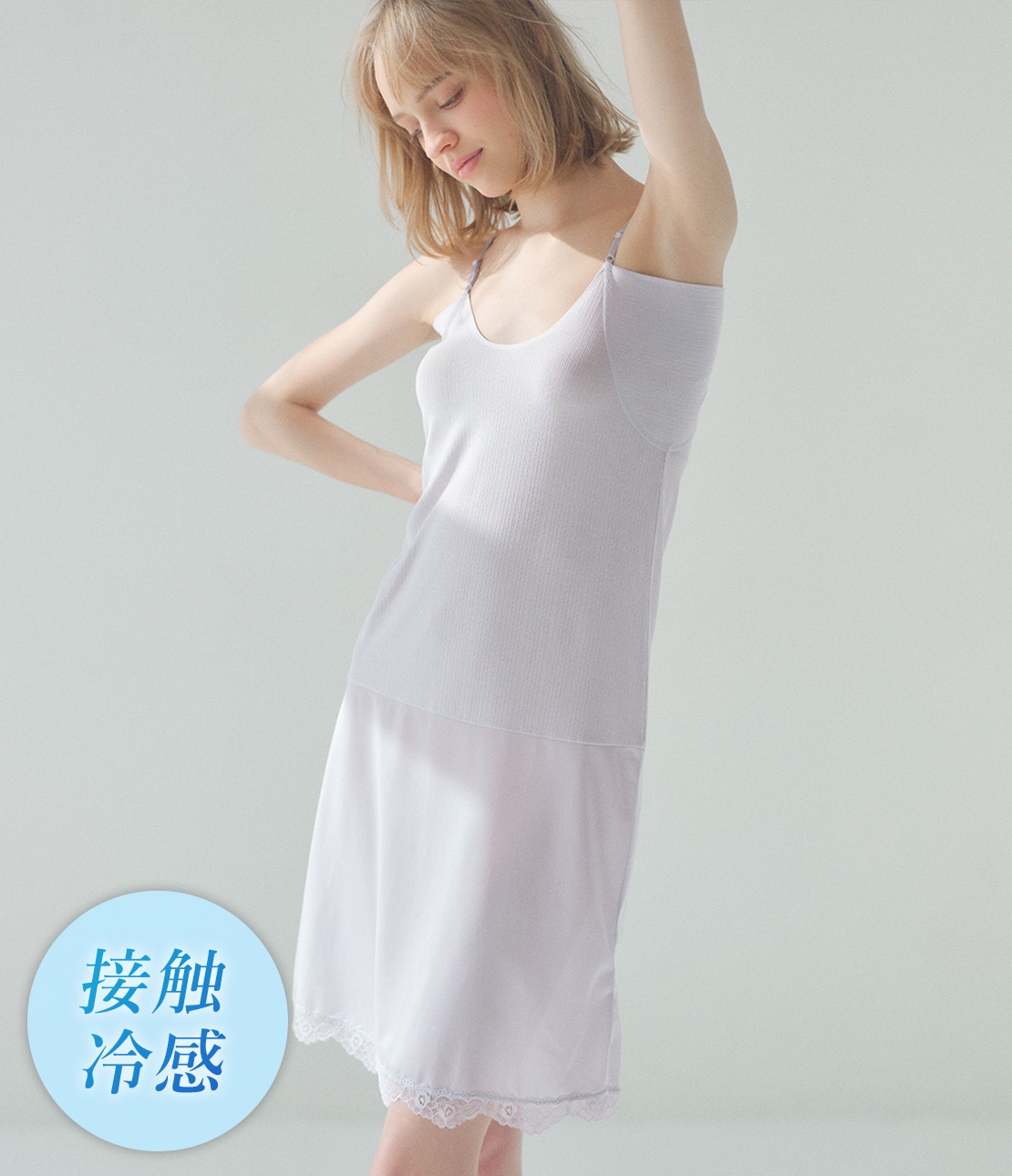 ワキ汗対策キャミとペチコートが一体化。吸水速乾&接触冷感機能で涼しく。