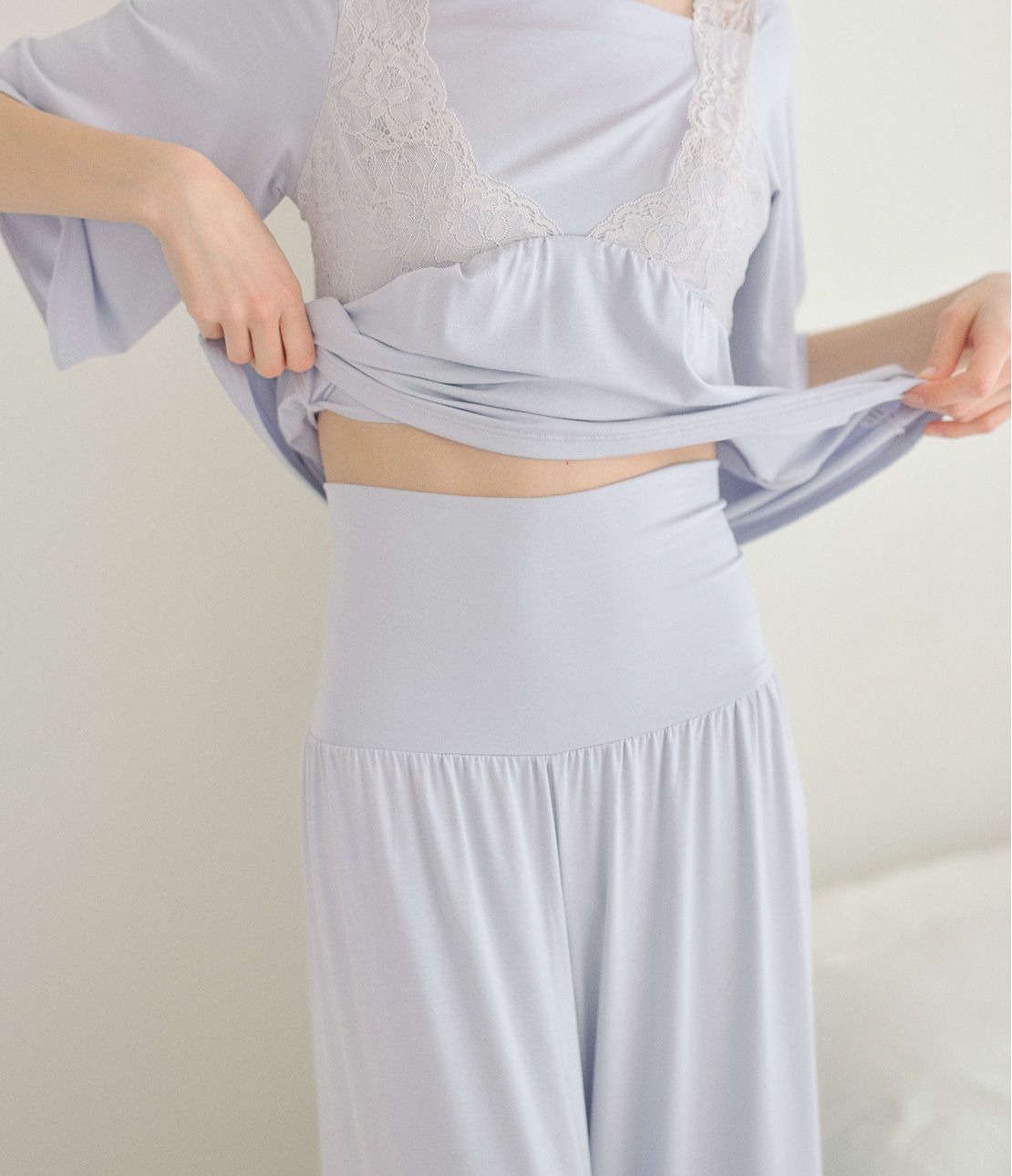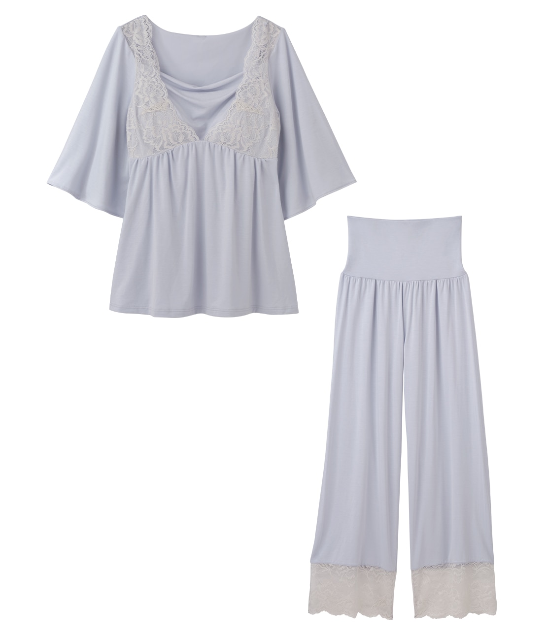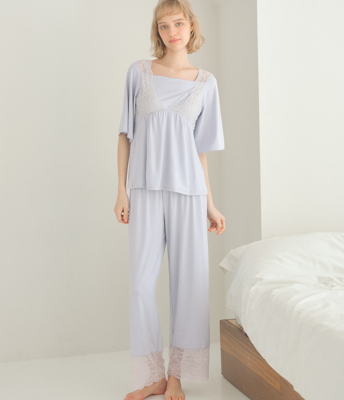 ・トップスの胸元とボトムの裾は、華やかなストレッチレース