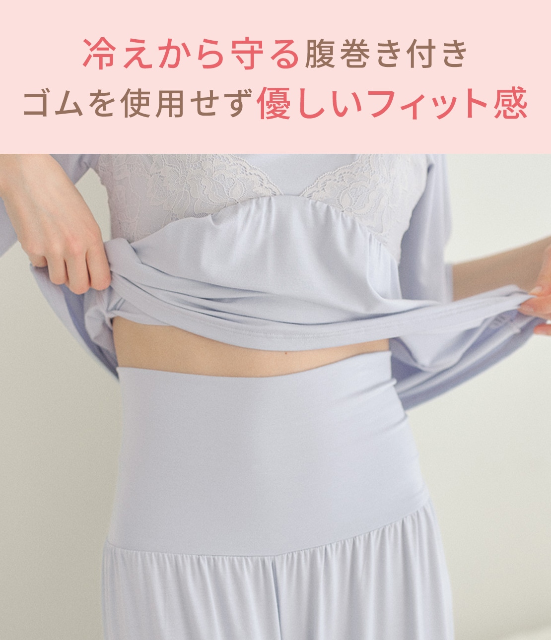 ・ハイウエストで、共生地二重の腹巻き付き。腹巻き部にはゴムを使わず、やさしいフィット感