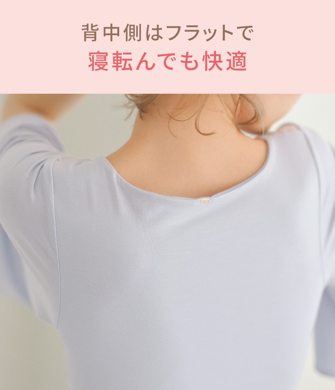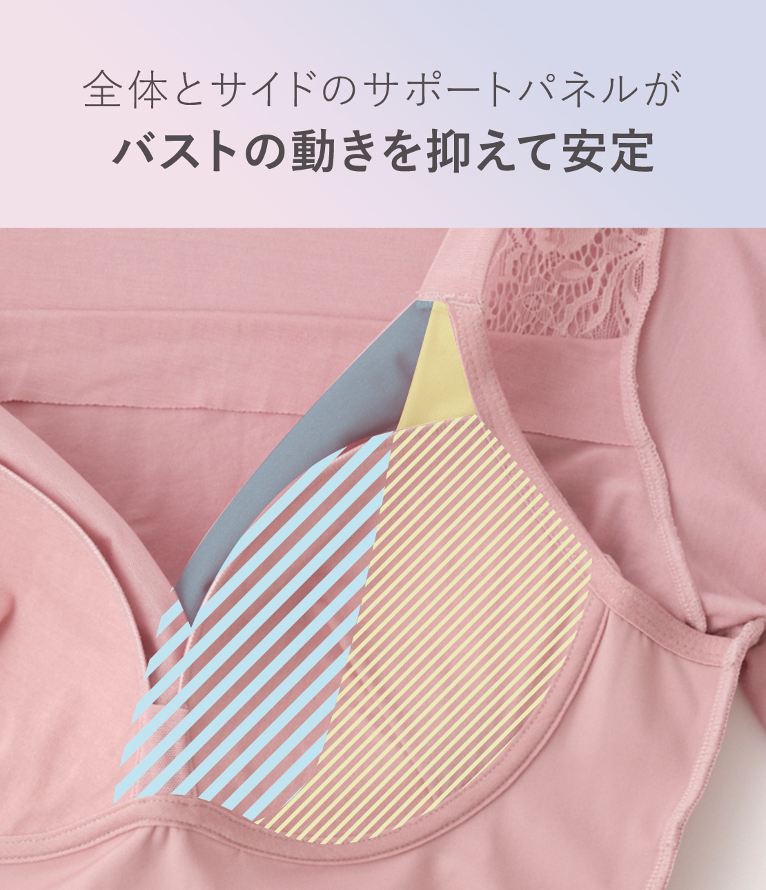 ・ブラ部の土台、バックパネル(裏生地)は2WAYジャージー。ふちにゴムを使わない切りっぱなしで、肌あたりやさしくピタッとフィット。カップの密着感を高め、フィッティングを安定させる。