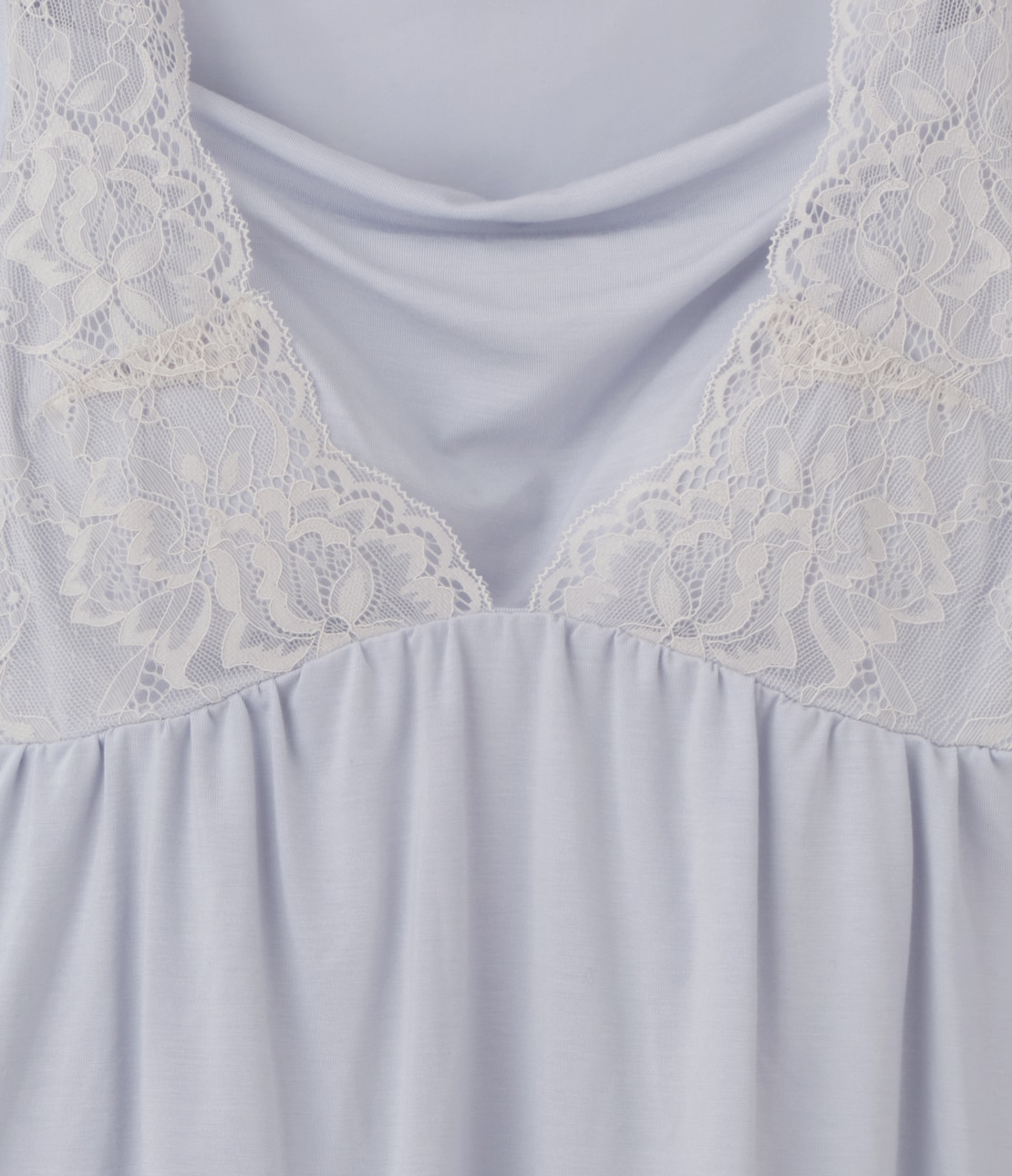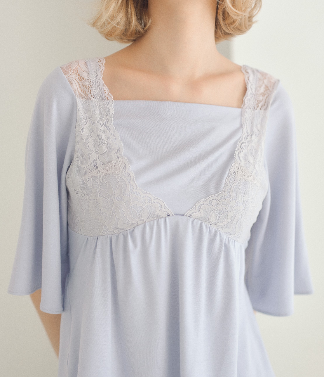 ・ネックラインは谷間が見えにくい高さ。胸元にタテ長のストレッチレースをレイヤード