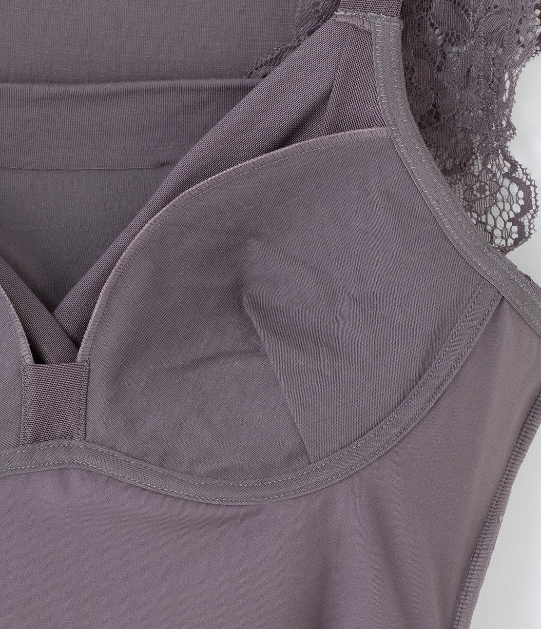 ・ネックラインは谷間が見えにくい高さ。胸元からフレンチスリーブ風の袖にかけて、ストレッチレースをあしらって華やか