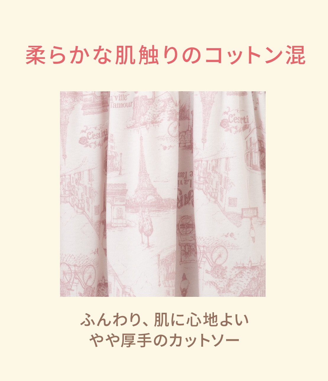 ・トップス、ボトムスともにやや厚みがあり、柔らかな肌ざわりのコットン混生地。