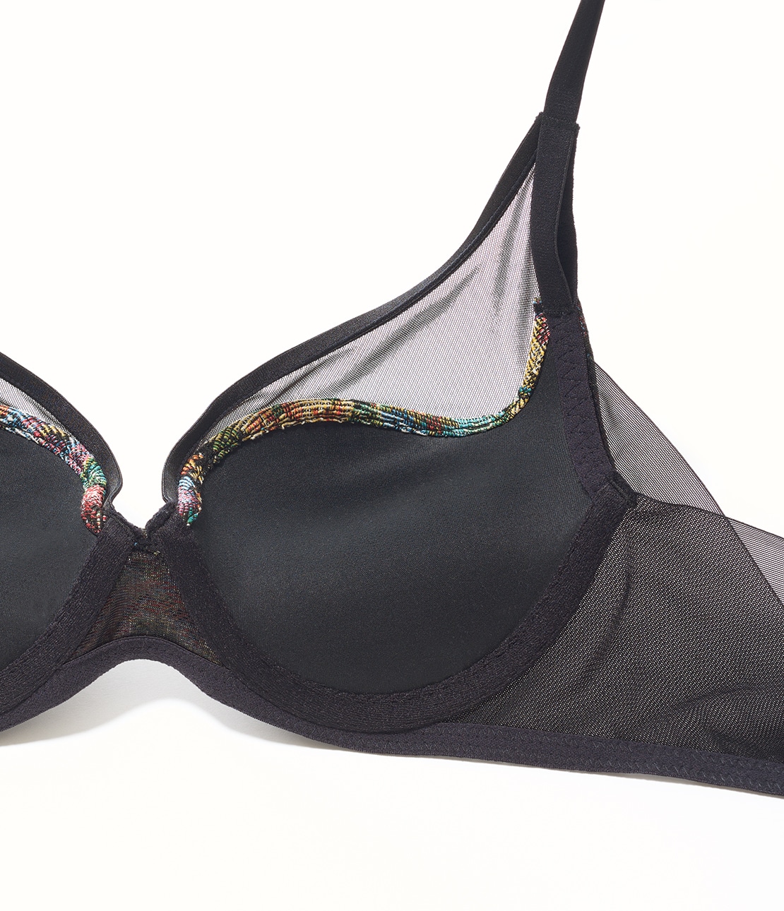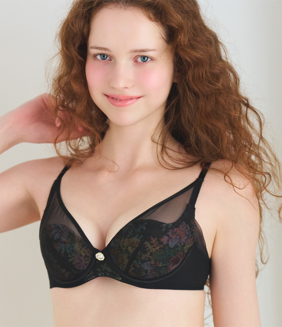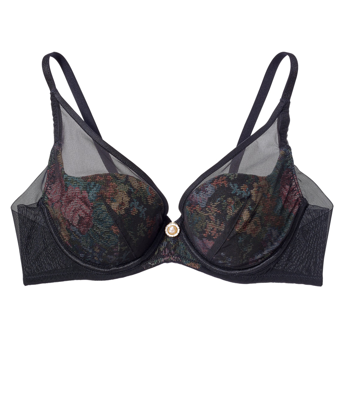 ・カラフルな花柄ヴィンテージジャカード生地のカップに、シアーな薄手パワーネットを重ねた縦長のカップデザイン